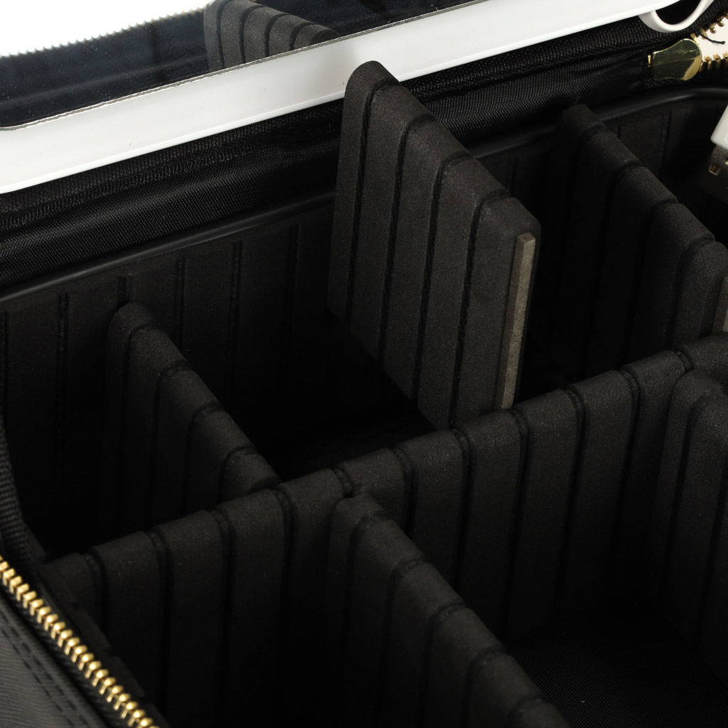 lusterko z podświetleniem LED. Wewnątrz kosmetyczka ma wiele przegródek, które