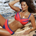 Seksowne bikini – czyli dwuczęściowy kostium kąpielowy z biustonoszem wiązanym zarówno na szyi, jak i na plecach i figami wiązanymi po obu stronach bioder. W pięknej, tropikalnej kolorystyce. Warte uwagi. Biustonosz jest usztywniany wkładką, którą można wyjąć. Świetnie zbiera piersi i znacząco je unosi, tworzy zmysłowy dekolt. Miseczki bez fiszbin, z możliwością przesuwania ich po sznureczku (wiązaniu), bez push up-a. Figi o dobrej wysokości, komfortowe. Włoska, wysokogatunkowa tkanina Carvico Tesutti.