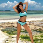 Seksowny kostium kąpielowy dwuczęściowy wykonany z włoskiej tkaniny Carvico Tessuti. Biustonosz z usztywnianymi miseczkami, z fiszbinami, oraz z niewyjmowanymi wkładkami push-up. Biustonosz zapinany na plecach, ramiączka ozdobne, regulowane, zapinane nietypowo. Majteczki o niskim kroju na podszewce, gładkie, wiązane.
