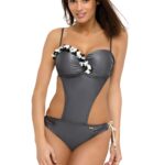 Propozycja dla miłośniczek mody. Kristina M-538 to niepowtarzalny kostium kąpielowy, którego ramiączka można wiązać na kilka sposobów. Dzięki temu co dzień masz szansę na inny Look. Na szyi, na plecach, ukośnie pod biustem, a może na kokardkę pod piersiami? Zaskocz wszystkich! Załóż kostium, który może się zmieniać. Biustonosz w seksownej konstrukcji, z usztywnianymi miskami, z fiszbinami i poduszkami push-up – od razu przybliża ku sobie, unosi i powiększa piersi. Push-up występuje w każdym rozmiarze kostiumu i nie jest wyciągany z modelu. Obwód zapinany na plecach. Słodkie figi wykonane z kwiecistej tkaniny, wygodnie wiążą się bo bokach bioder. Zamów go i niech trwa wakacyjna zabawa!