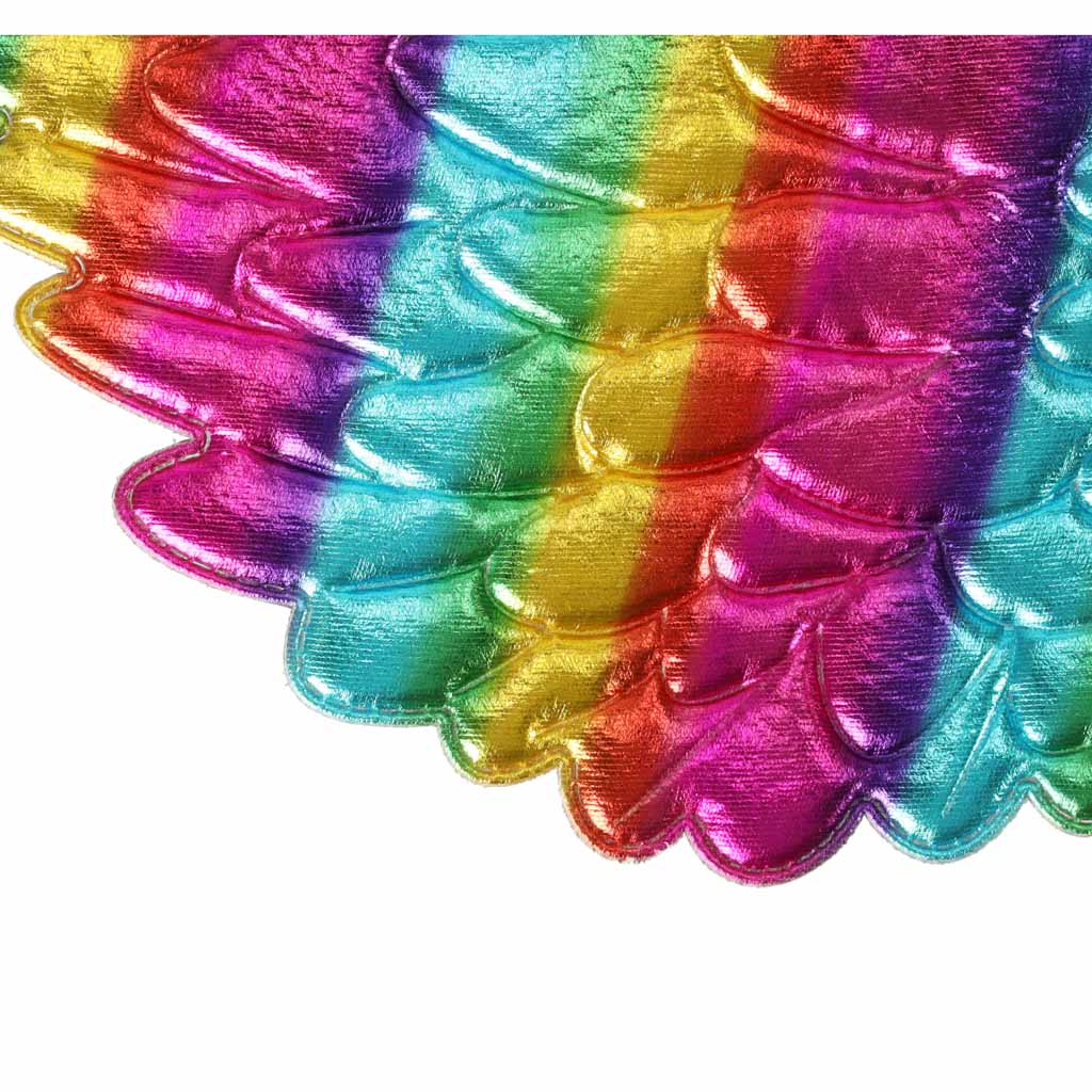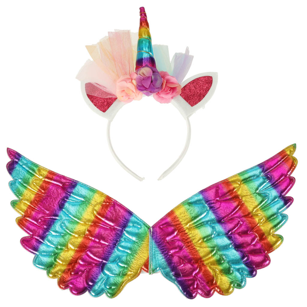 Tęczowy kostium jednorożca – idealny na bal przebierańców czy imprezę tematyczną. W zestawie tiulowa spódnica, opaska z rogiem i kolorowe skrzydła. Tworzywo: poliester. Długość spódnicy: 30 cm. Szerokość gumki: 2x 25-47 cm.