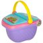 Wiek: 3+. Kolory: fioletowy, różowy, niebieski, żółty. Materiał: tworzywo sztuczne (cerata lekko gumowa). Wysokość koszyka z rączką: 24 cm. Wysokość bez rączki: 14,7 cm. Spód: 17 x 14 cm. Górna część: 19 x 24 cm. Koszyk posiada dwie otwierane klapki, górn