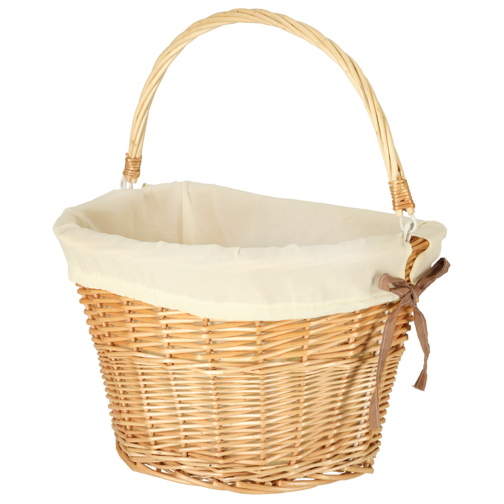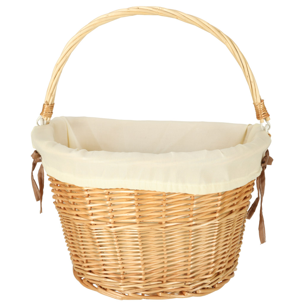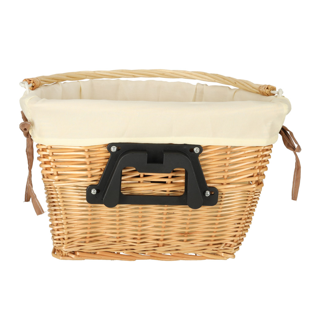 Wiklinowy kosz rowerowy z materiałowym białym wkładem. Posiada rączkę do łatwego przenoszenia. Mocowanie typu „click” ułatwia odpinanie i przypinanie koszyka. W zestawie elementy do montażu. Tworzywo: wiklina, poliester. Wymiary: 26 cm x 43 cm x 23 cm.
