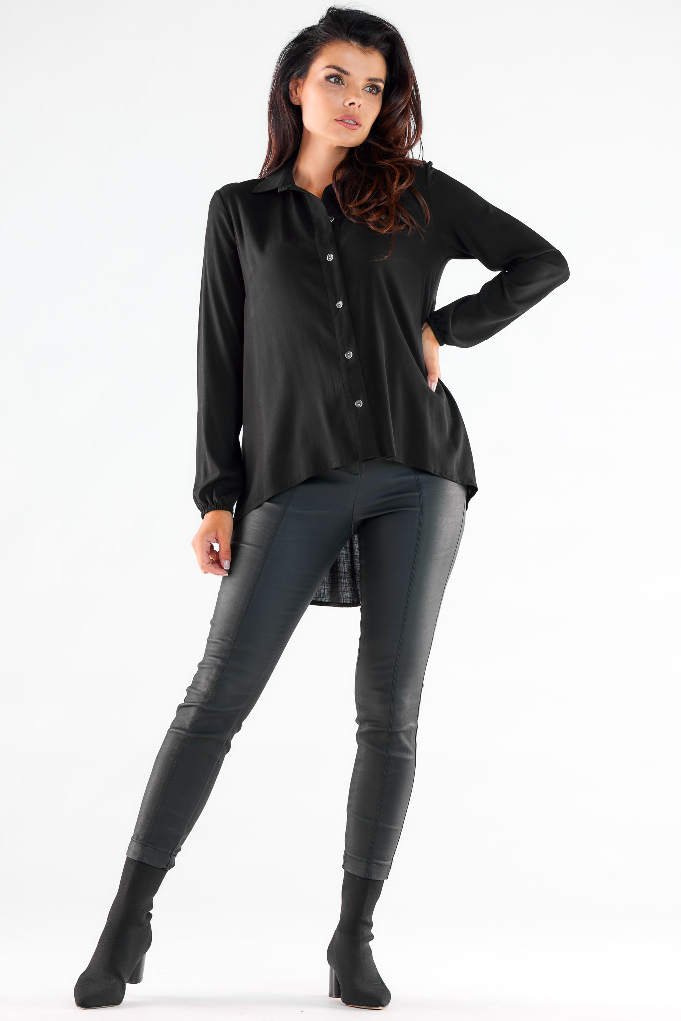 Elegancka koszula z długim rękawem oraz przedłużonym tyłem. Mankiety zakończone gumką dodają koszuli luźnego charakteru. Luźny krój koszuli pozwala na zamaskowanie delikatnych niedoskonałości. W połączeniu ze spodniami z imitacji skóry można stworzyć stylizację na styl miejski. Produkt zaprojektowany i uszyty w Polsce.