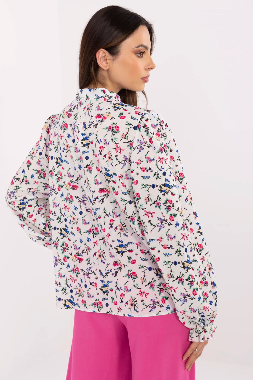 Stylowa koszula damska o eleganckim kroju to idealna propozycja do pracy i na wizytowe okazje. Wykonana z miękkiego, elastycznego materiału będącego połączeniem poliestru i elastanu, zapewnia wygodę i dopasowanie przez cały dzień. Klasyczna stójka i zapięcie na guziki podkreślają formalny charakter koszuli, a bufiasty długi rękaw dodaje całości subtelnego, kobiecego akcentu. Kwiatowy wzór nadaje koszuli delikatności i lekkości, sprawiając, że świetnie sprawdzi się zarówno w biurowej stylizacji, jak i podczas oficjalnych spotkań.