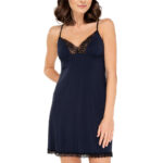 Subtelna, delikatna w dotyku koszulka nocna uszyta z miękkiej wiskozy w granatowym kolorze. Miseczki zdobione piękną, czarną, ażurową koronką, kusząco akcentują dekolt. Pod biustem przeszycie. Góra profilowana w konstrukcji soft. Koszulka poszczycić się może również lekko dopasowaną formą, w której poczuje się niezwykle kobieco. Ramiączka cienkie, regulowane. Linia ud także z koronkowym akcentem.