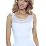 Koszulka bez rękawków z tiulową wstawką na dekolcie i aplikacją. Zaprojektowana i uszyta w Polsce.