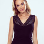 Koszulka bez rękawów z bogato zdobionym tyłem z koronki, która przechodzi na przód aż do dekoltu. V-dekolt. Zaprojektowana i uszyta w Polsce.