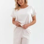 Koszula damska to elegancki i komfortowy element garderoby, wykonany z wysokiej jakości bawełny. Posiada krótki rękaw i dekolt w kształcie litery V, co nadaje jej klasycznego i uniwersalnego charakteru. Wyjątkowy detal stanowi wykończenie dekoltu i mankietów delikatną siateczką, dodając koszuli subtelności i wyrafinowania. Jej długość sięga do kolan, co sprawia, że jest idealna zarówno do noszenia na co dzień, jak i na specjalne okazje. Składająca się w całości z 100% bawełny, koszula gwarantuje miękkość, trwałość i komfort noszenia, będąc doskonałym wyborem dla kobiet ceniących sobie jakość i styl.