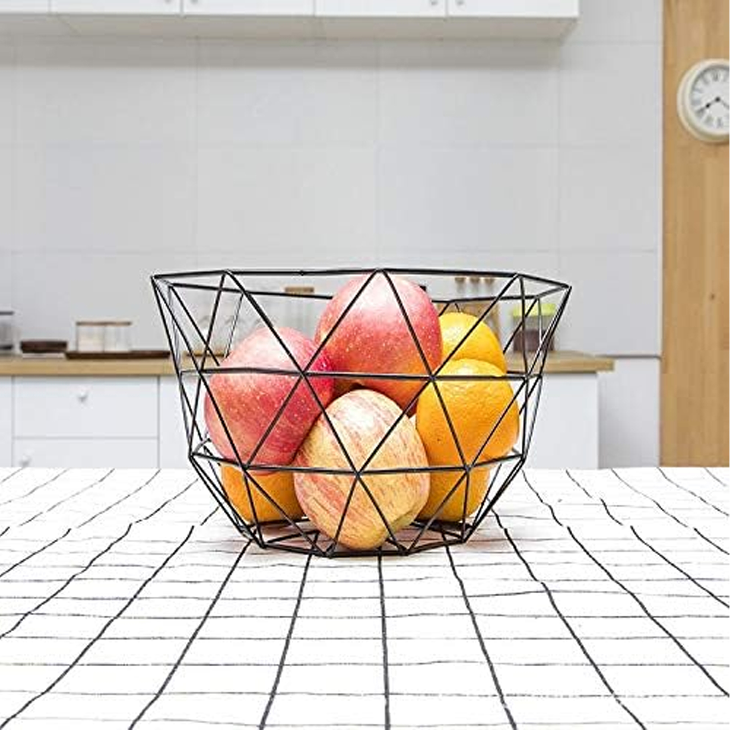 ✔️ DO PRZECHOWYWANIA – Geometryczny koszyk o średnicy 26 cm, wykonany z metalu i drewna, posłuży do przechowywania owoców oraz warzyw.