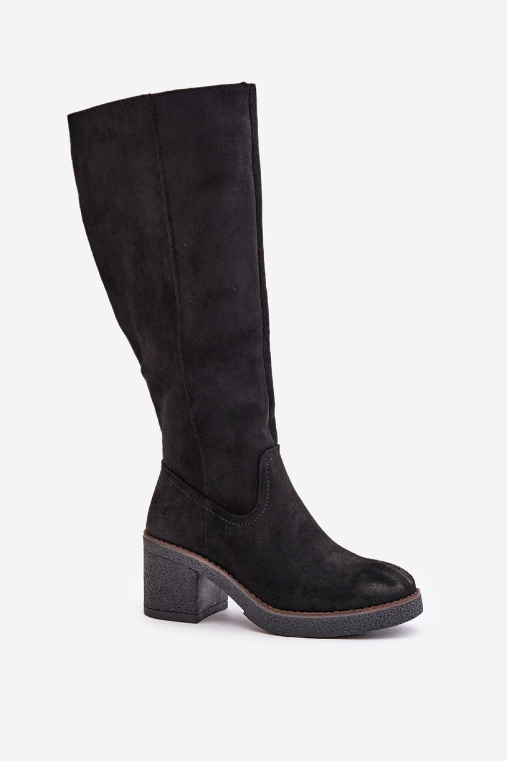 Kozaki marki Jezzi wykonane z eko zamszu to idealna propozycja na chłodniejsze dni. Osadzone na stabilnym obcasie typu słupek. Model zapinany na zamek, co ułatwia zakładanie i zdejmowanie. Noski zaokrąglone. Ocieplenie kocem obuwniczym gwarantuje ciepło i komfort, czyniąc te kozaki idealnym wyborem do codziennych stylizacji.