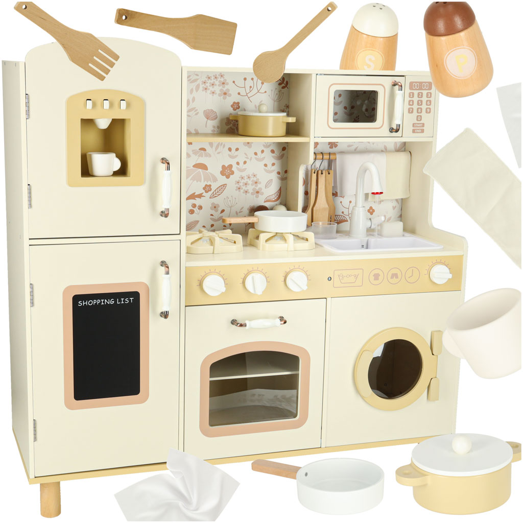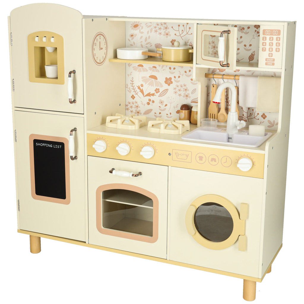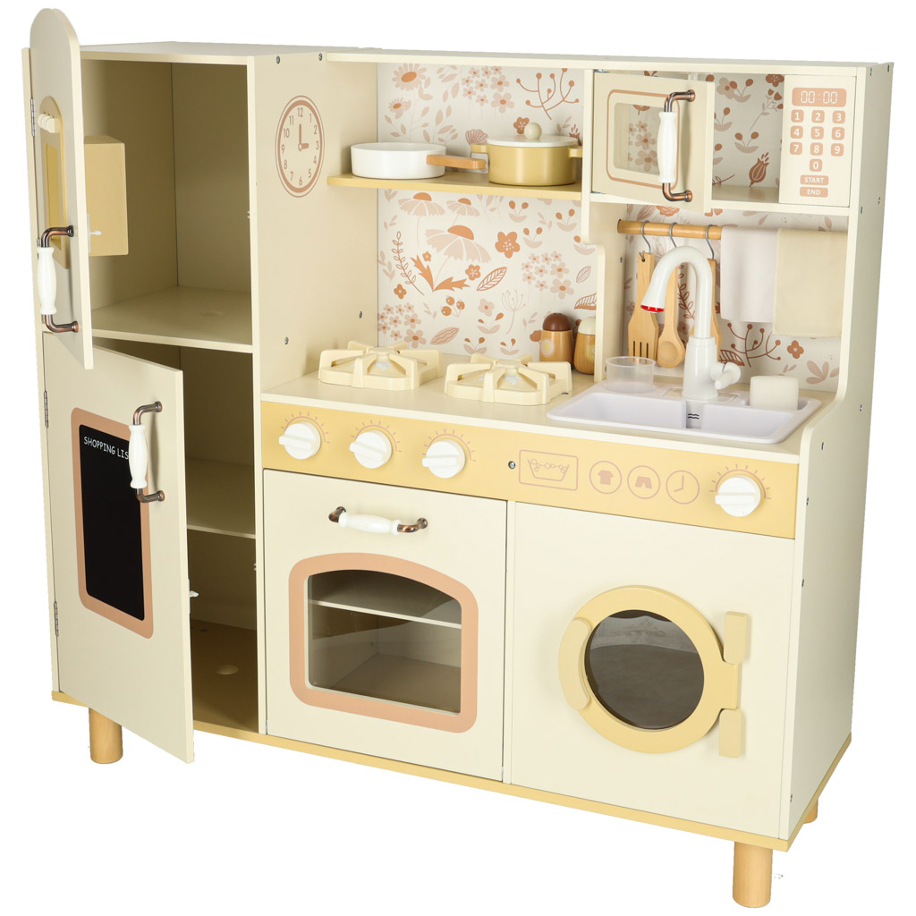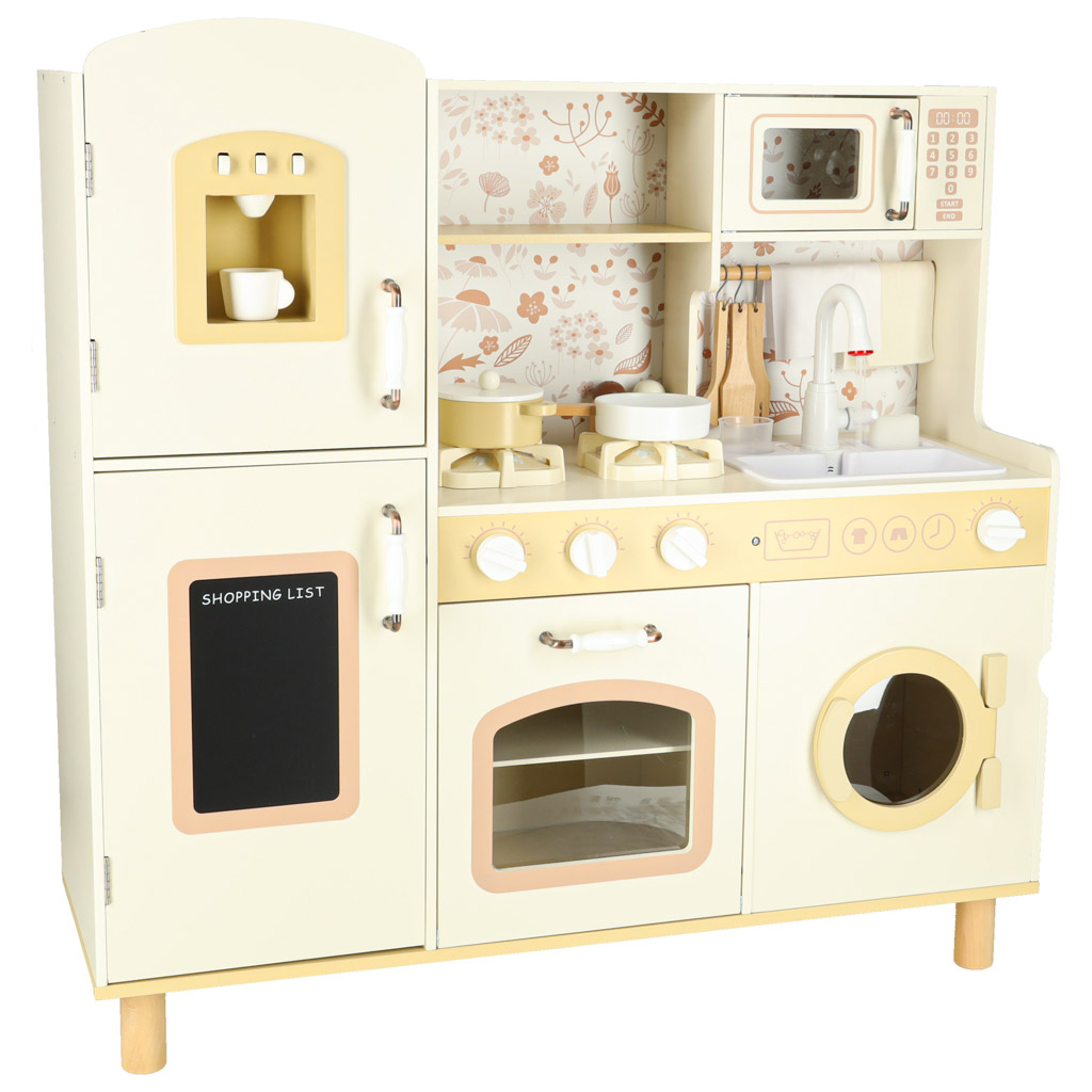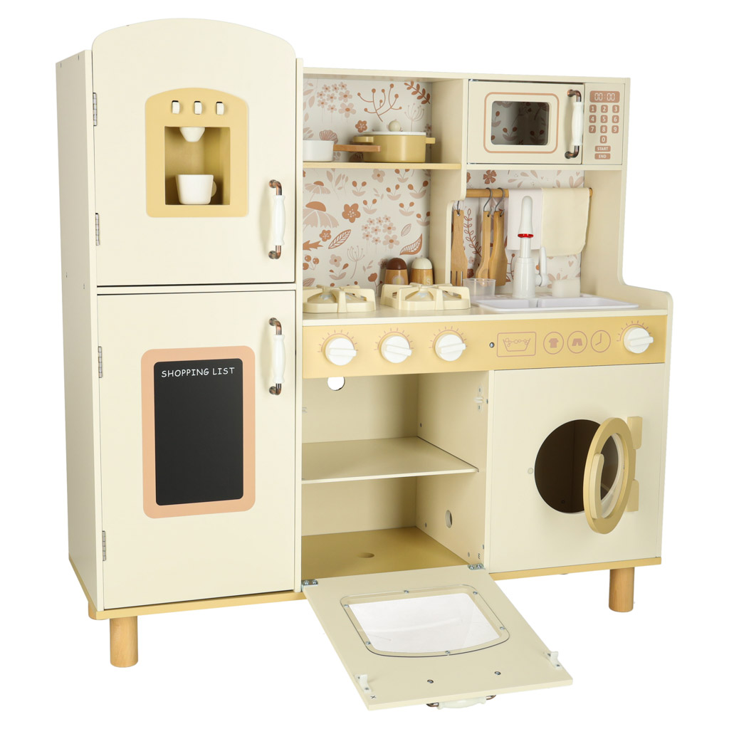 Kuchnia drewniana dla dzieci z MDF o wysokości 90 cm, wyposażona w 2 palniki LED z dźwiękiem, piekarnik, mikrofalówkę, pralkę, zlew z kranem (przepływ wody), szafki, półkę tablicową i akcesoria. Stabilna, trwała, do użytku wewnętrznego.