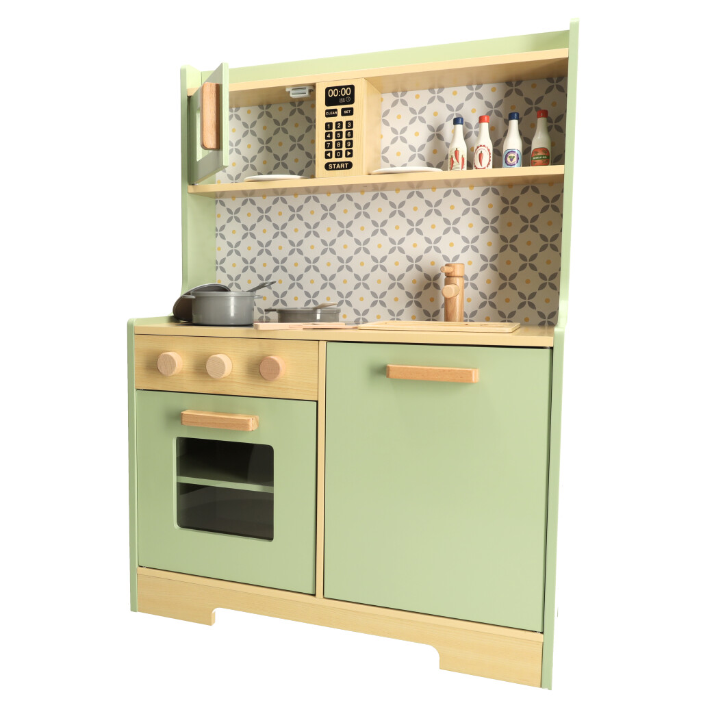 Drewniana kuchnia dla dzieci w pięknym kolorze i z dużą ilością elementów – piekarnik, mikrofalówka, kuchenka i zlew. A dodatkowe różne akcesoria do gotowania. Zabawa w kucharza pozytywnie wpłynie na dziecięcą wyobraźnię. Wymiary: 86,2 x 61 x 29 cm.