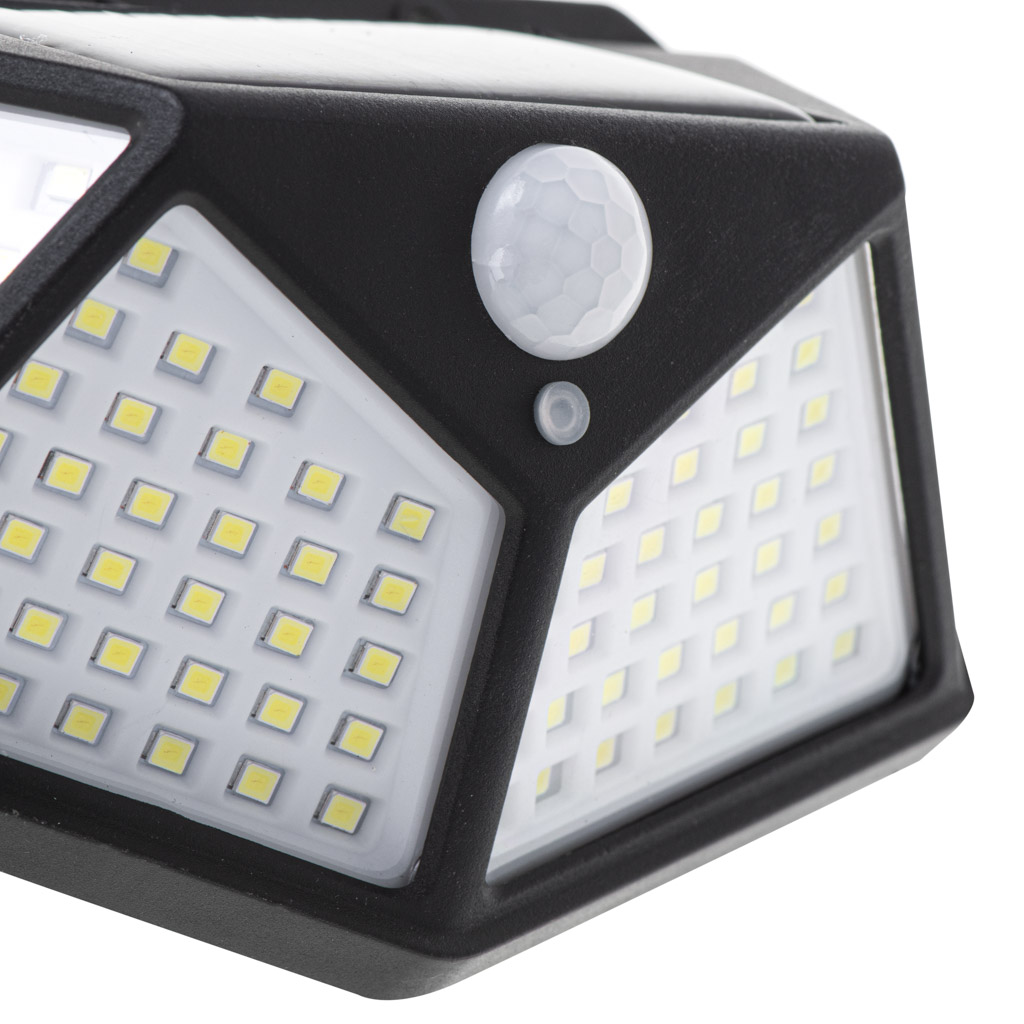 Lampa solarna 100LED z czujnikami ruchu i zmierzchu. Dzięki wbudowanym czujnikom, lampa zapala się automatycznie w słabo oświetlonym miejscu i kiedy wykryje ruch. Zasięg czujnika ruchu do 3-5m. Ilość trybów pracy: 3. Wymiary: 13,5 x 9,6 x 5cm.