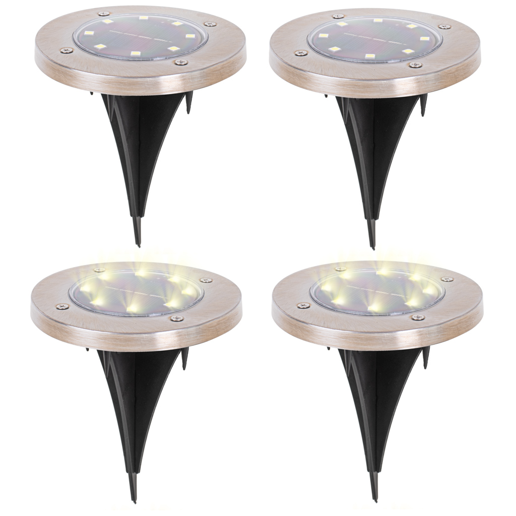 Ilość lampek w zestawie: 4 sztuki. Kolory: metalowy i czarny. Rodzaj: lampy ogrodowe gruntowe najazdowe. Typ: lampy solarne zewnętrzne z czujnikiem zmierzchu. Zasilanie: akumulator Ni-MH 600 mAh. Źródło światła: 8 diod LED / barwa: ciepła. Czas świecenia: