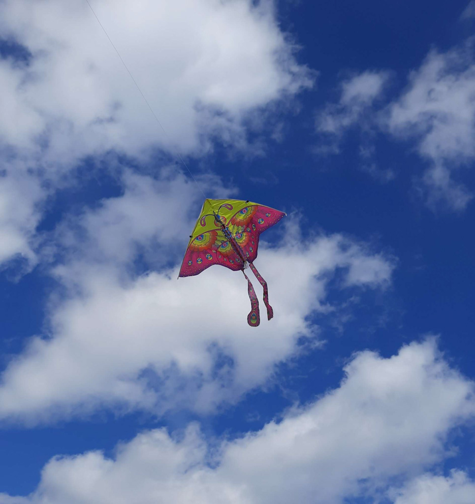 Latawiec w kształcie motyla, wykonany z poliestru. Linka z uchwytem w zestawie. Wymiary: 90x90cm.