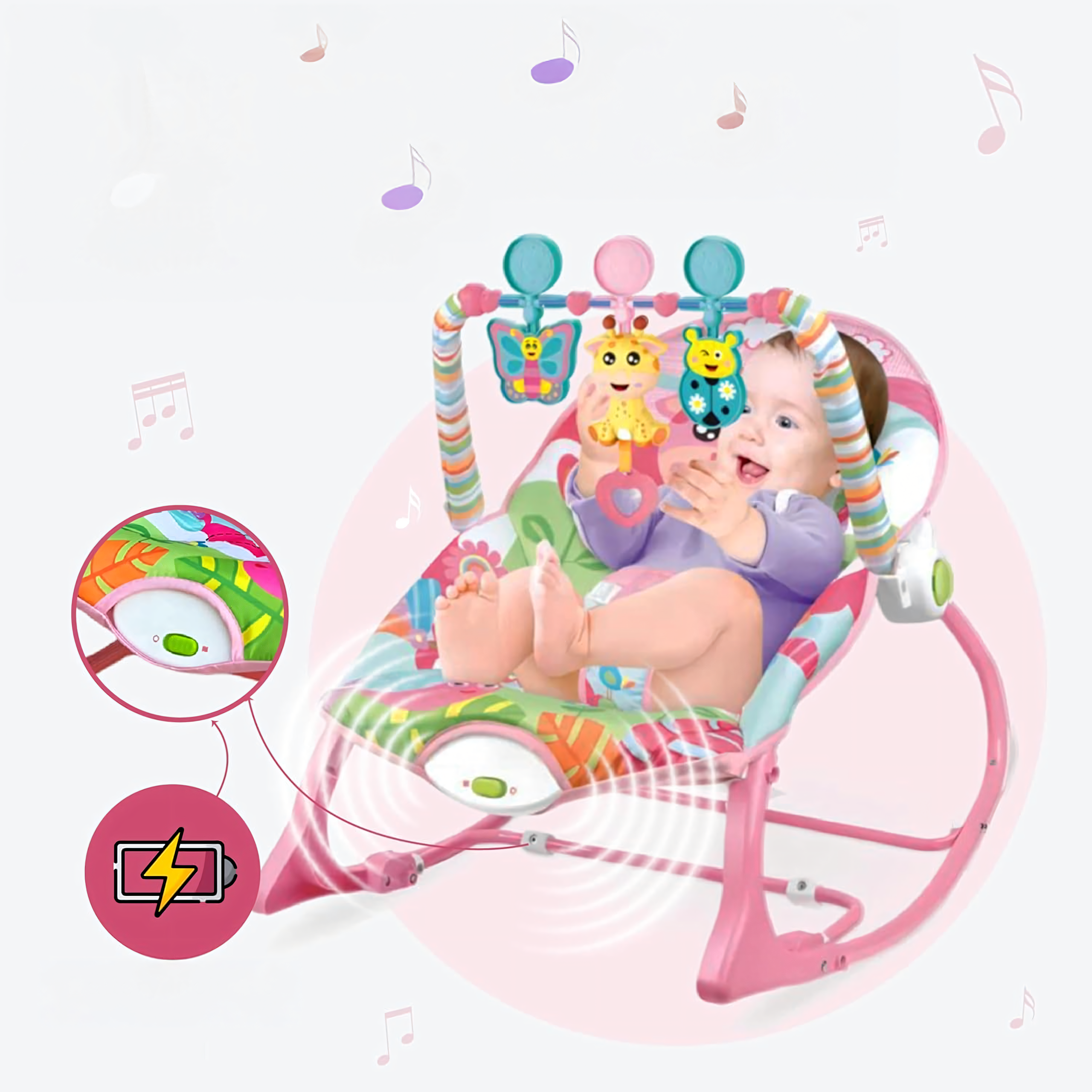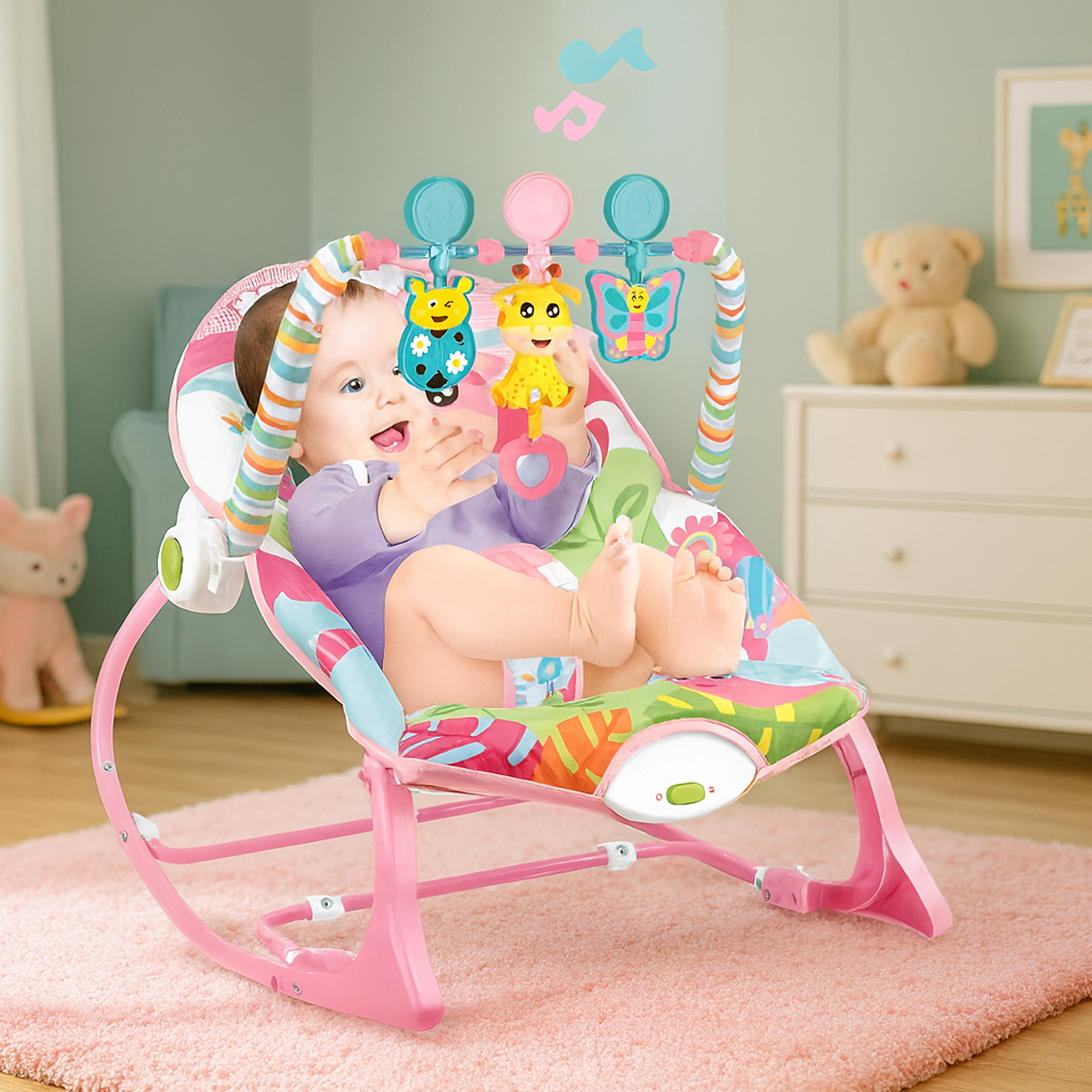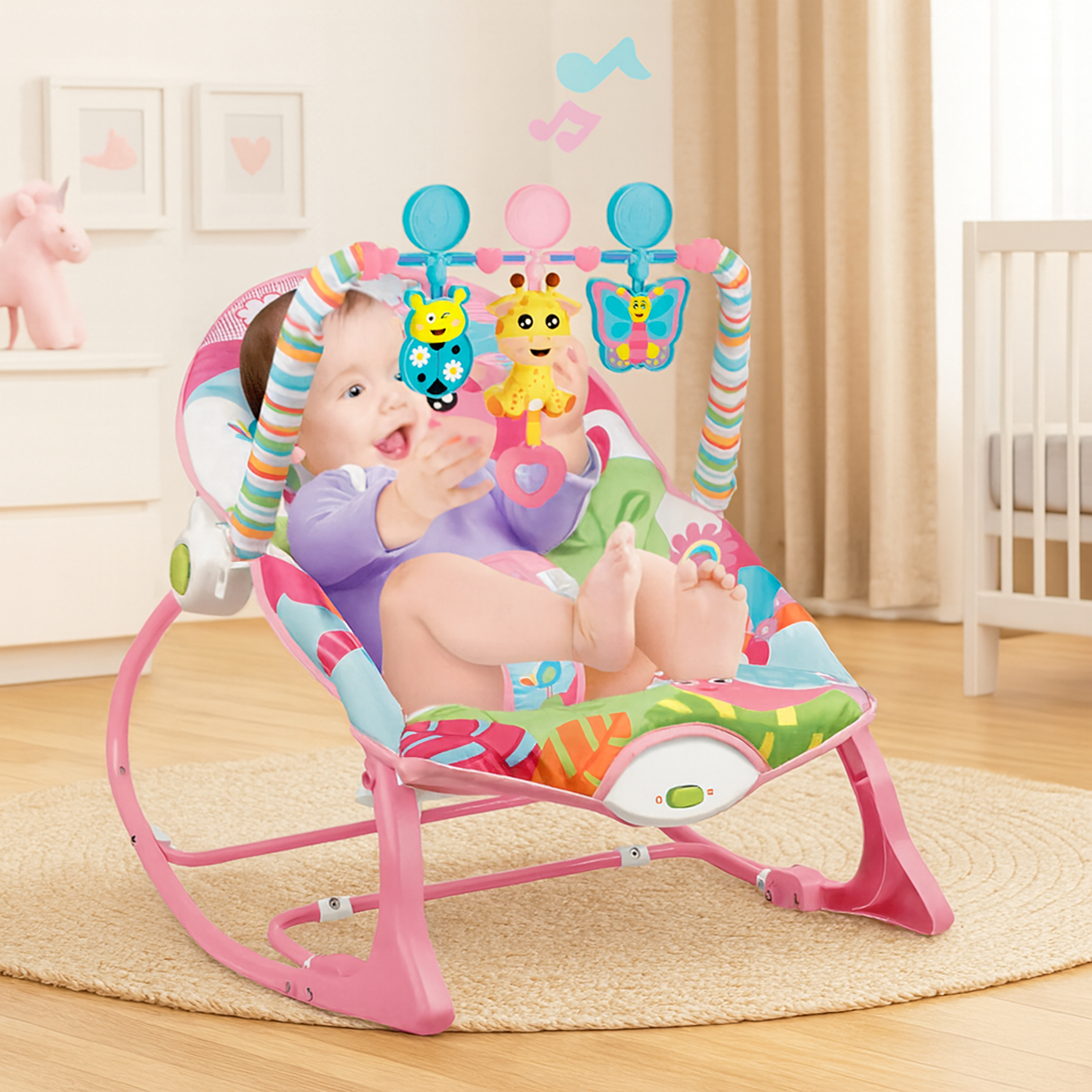 Leżaczek–bujaczek 3w1 z wibracjami i muzyką to idealne połączenie komfortu, zabawy i bezpieczeństwa dla Twojego maluszka. Delikatne wibracje, uspokajająca muzyka i kolorowe grzechotki pomogą dziecku się wyciszyć, zasnąć lub radośnie bawić. Wygodne, regulowane oparcie i miękkie siedzisko zapewniają komfort już od pierwszych dni życia aż do 18 kg.