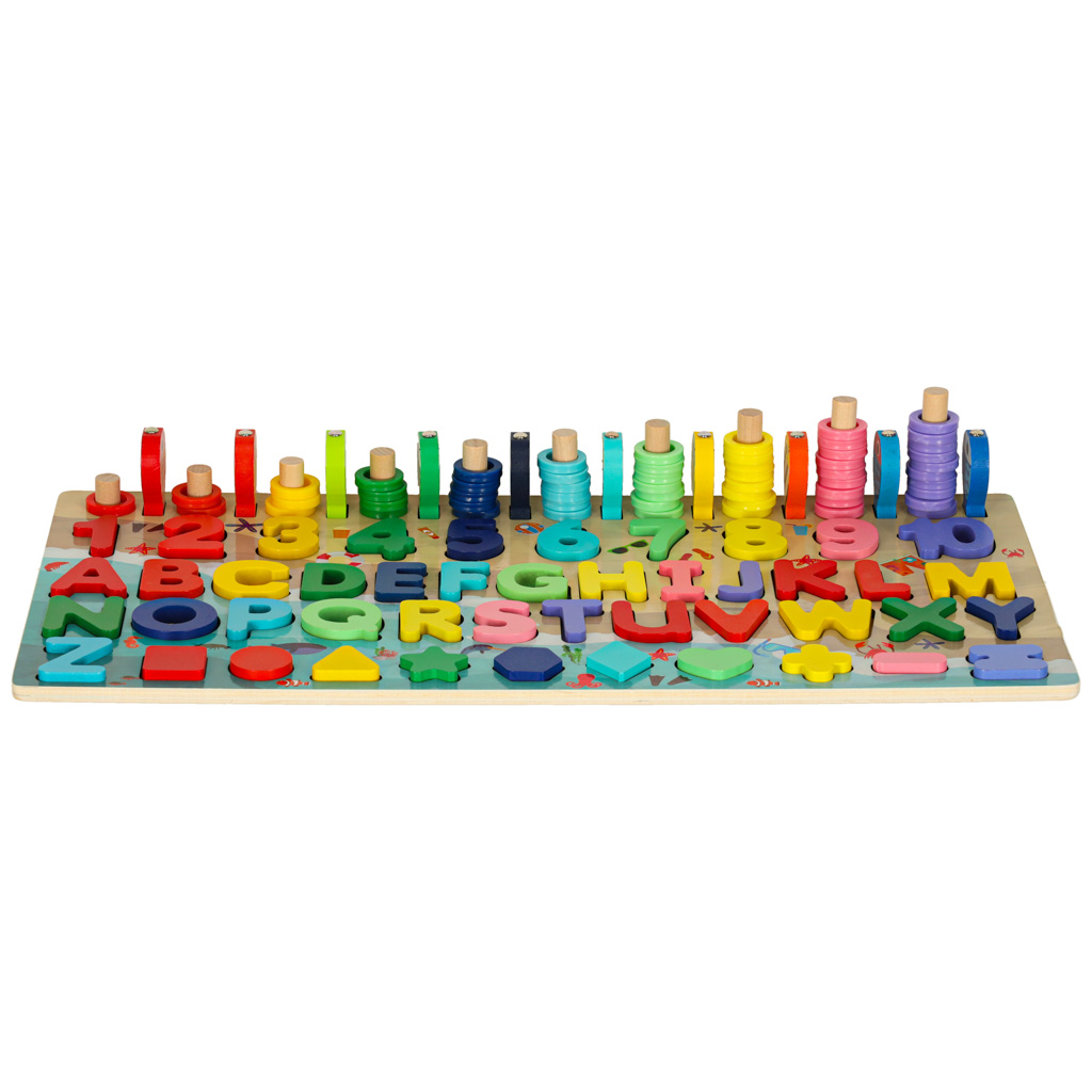 Drewniany, wieloelementowy sorter edukacyjny 3w1. Składa się z wklęsłych miejsc do dopasowania kolorowych cyfr, liter i figur geometrycznych oraz patyczków do układania krążków. Dodatkowym elementem jest gra łowienie rybek. Wymiary: 45×22,5×0,7cm.