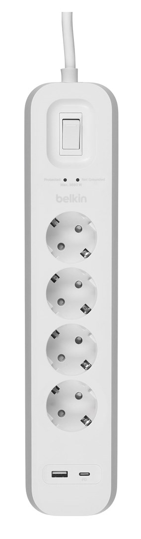 Listwa zasilająca Belkin Power Surge 4-PORT + 1xUSB-A +1xUSB-C 2.4A PD 525J 2m White Schuko