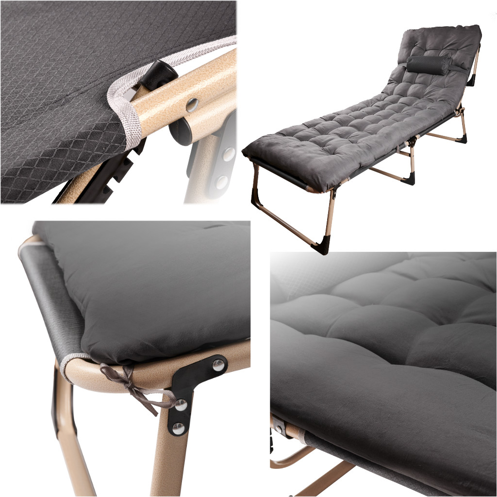 Wielofunkcyjne składane łóżko polowe z poduszką i materacem. Do użytku w domu, w namiocie oraz na kempingu – 4-poziomowy system regulacji oparcia pozwala korzystać z niego jak z leżaka. Wymiary łóżka: 193 cm x 66 cm x 23 cm, kolor: ciemny szary