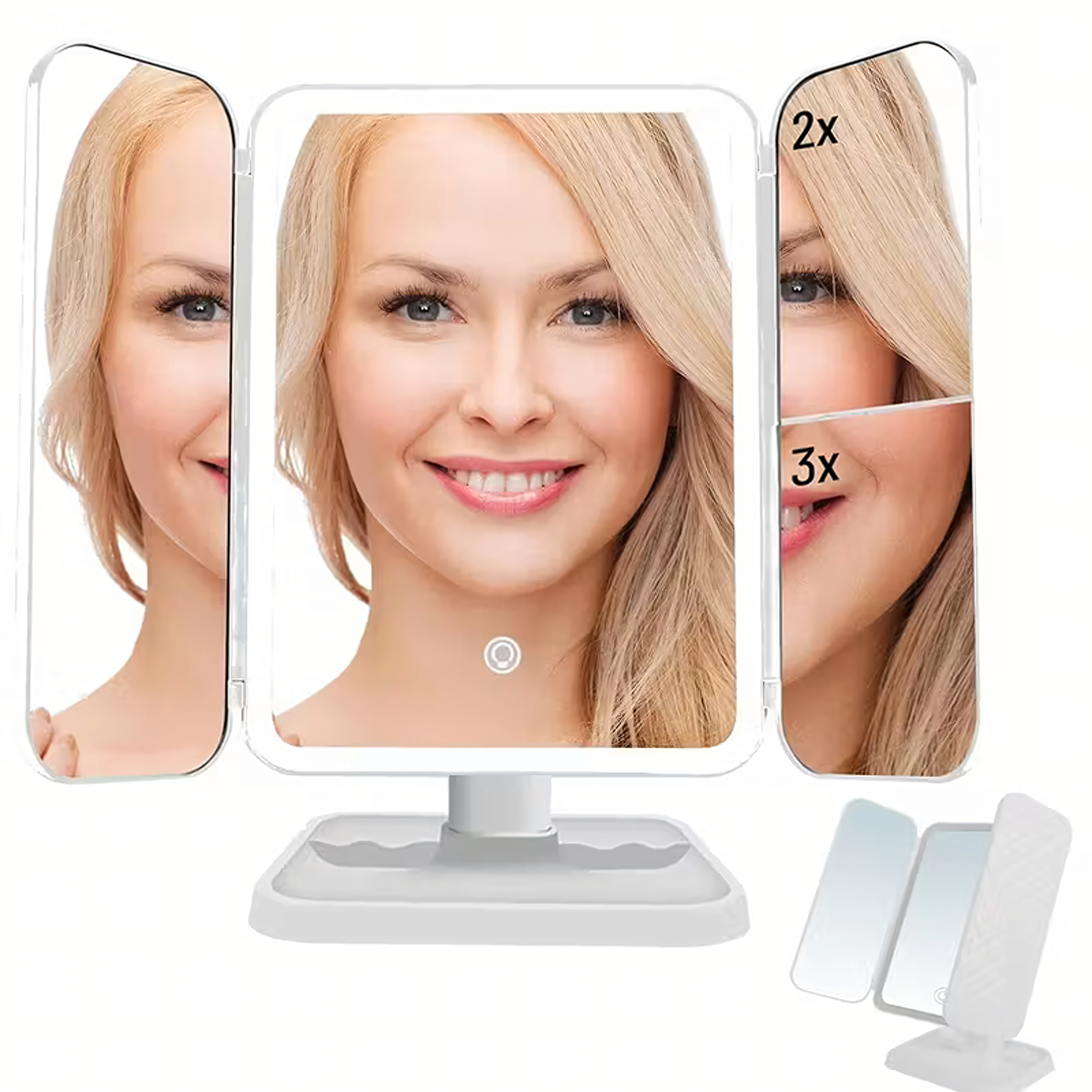 To eleganckie podświetlane lusterko LED z potrójnym panelem i regulacją kąta sprawi, że każdy detal Twojego makijażu będzie dopracowany. Dzięki regulowanemu podświetleniu LED (biały zimny, biały ciepły, neutralny) uzyskasz idealne warunki niezależnie od pory dnia. Zasilanie akumulatorowe z USB sprawia, że lustro jest wygodne i mobilne – idealne także w podróży.