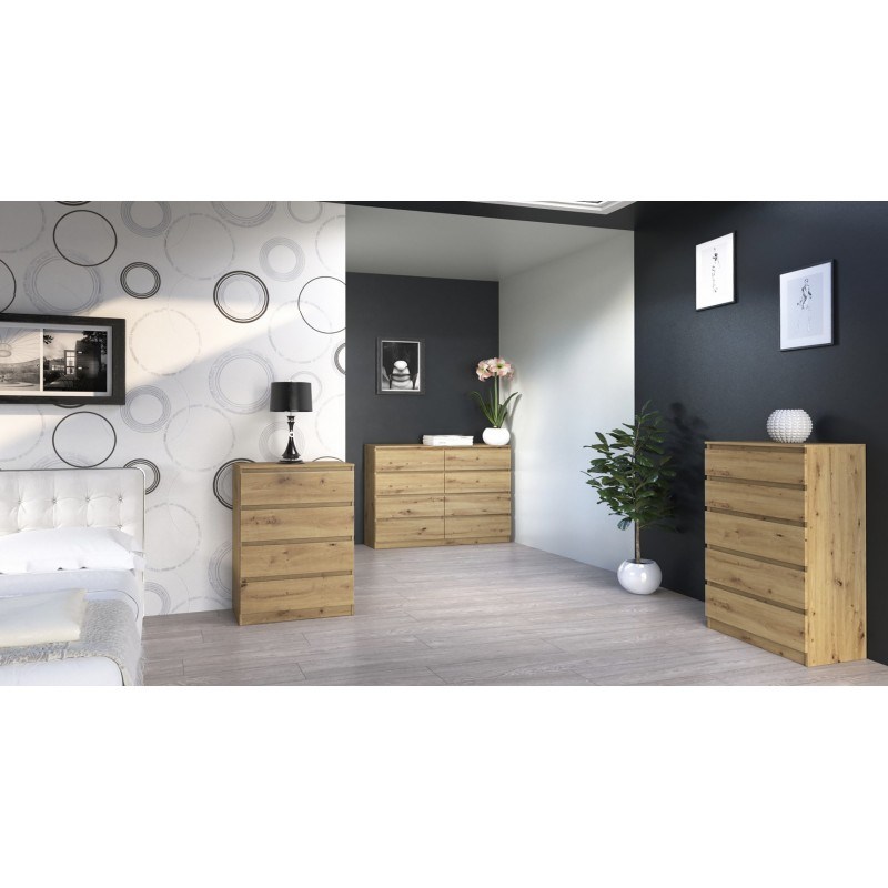 Płyta wiórowa laminowana wyróżnia się odpornością na naprężenia mechaniczne i ekstremalne temperatury, Obrzeża – wykończone tworzywem ABS (charakteryzującym się dużą wytrzymałością mechaniczną i chemiczną), Zdjęcia zestawów przedstawiają przykładową aranżację z innymi meblami z kolekcji. Pozostałe bryły są dostępne w osobnej sprzedaży., Meble do samodzielnego montażu, Gładkie boki bez zaślepek i widocznych otworów, Bezuchwytowe fronty, Szuflady – na prowadnicach rolkowych to gwarancja wygodnego, a przede wszystkim bezpiecznego użytkowania.