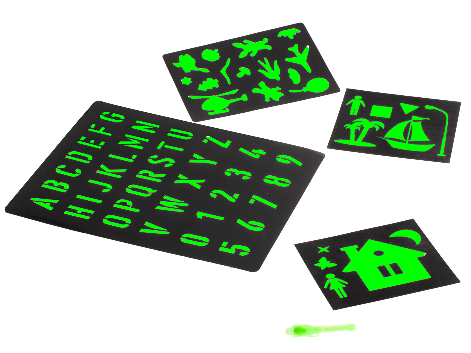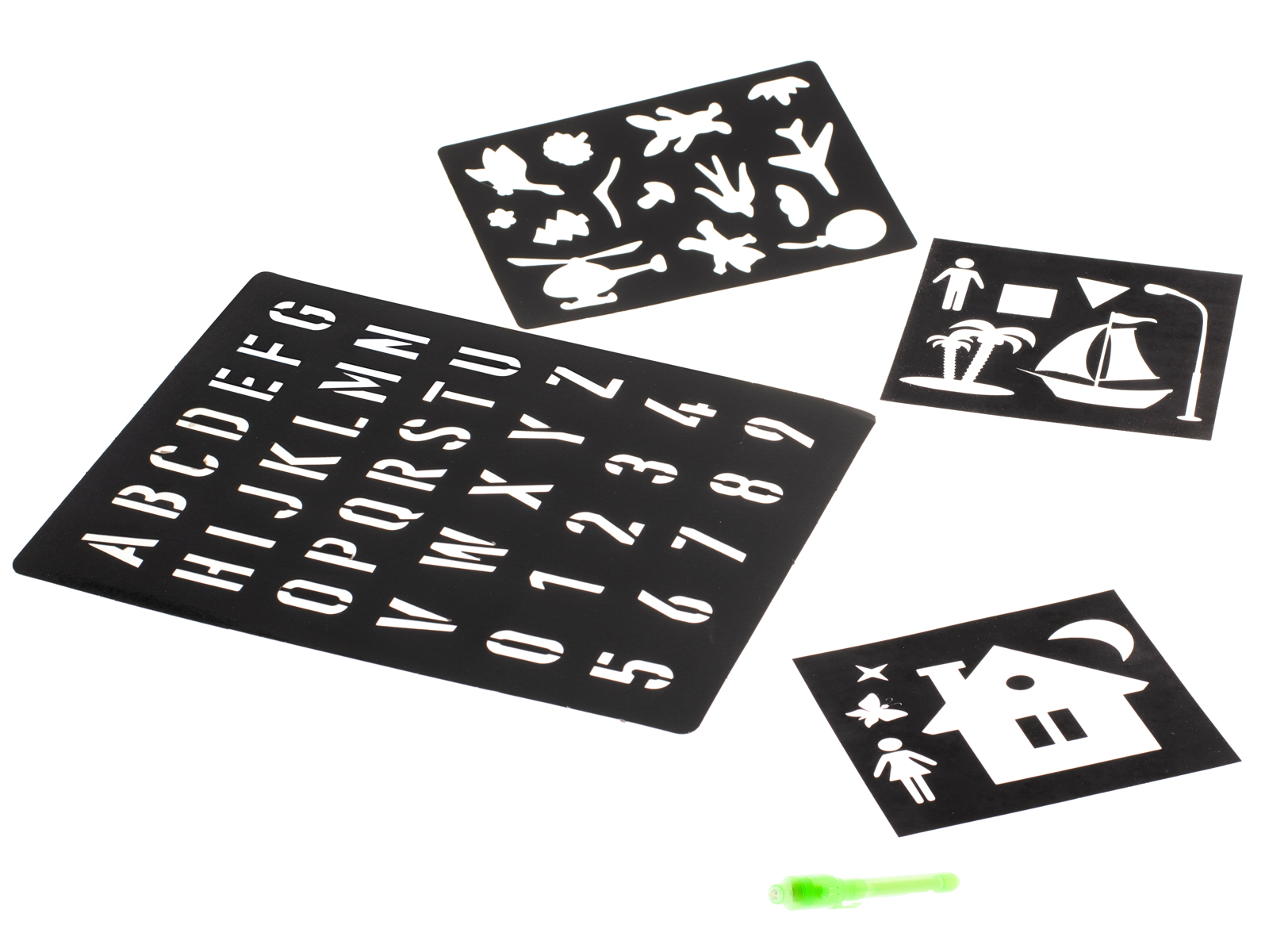 Zestaw do rysowania światłem. Polega na odrysowywaniu obrazków lub tworzeniu własnych rysunków za pomocą długopisu UV. Zabawa pobudzi kreatywność i wyobraźnię. W zestawie: tablica świecąca w ciemności, mazak UV i szablony. Wymiary tablicy:29×20,5cm.