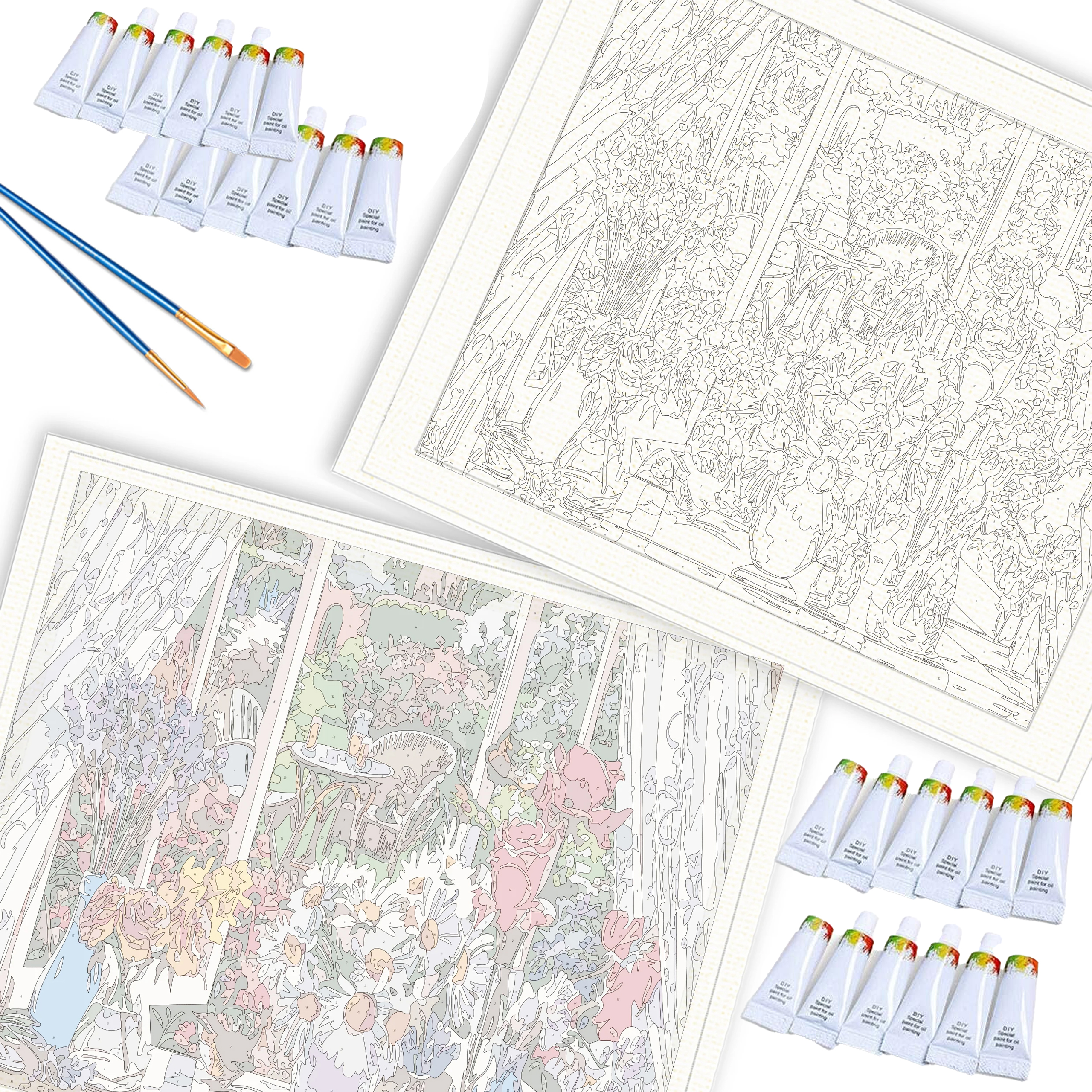 W skład zestawu wchodzi płótno z naniesionymi numerami w określonych polach. Każdy numer odpowiada określonemu kolorowi farby, a Twoim zadaniem jest wypełnienie tych pól odpowiednimi kolorami.