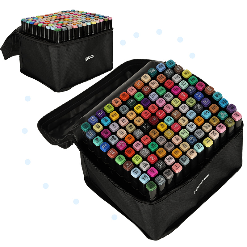 Zestaw markerów alkoholowych. Każdy marker posiada dwie końcówki – cienką i grubą. Malowanie i rysowanie to fantastyczny sposób na wyrażenie swojej kreatywności. W zestawie: 120 markerów, podstawka, etui. Dł. markera: 15cm.