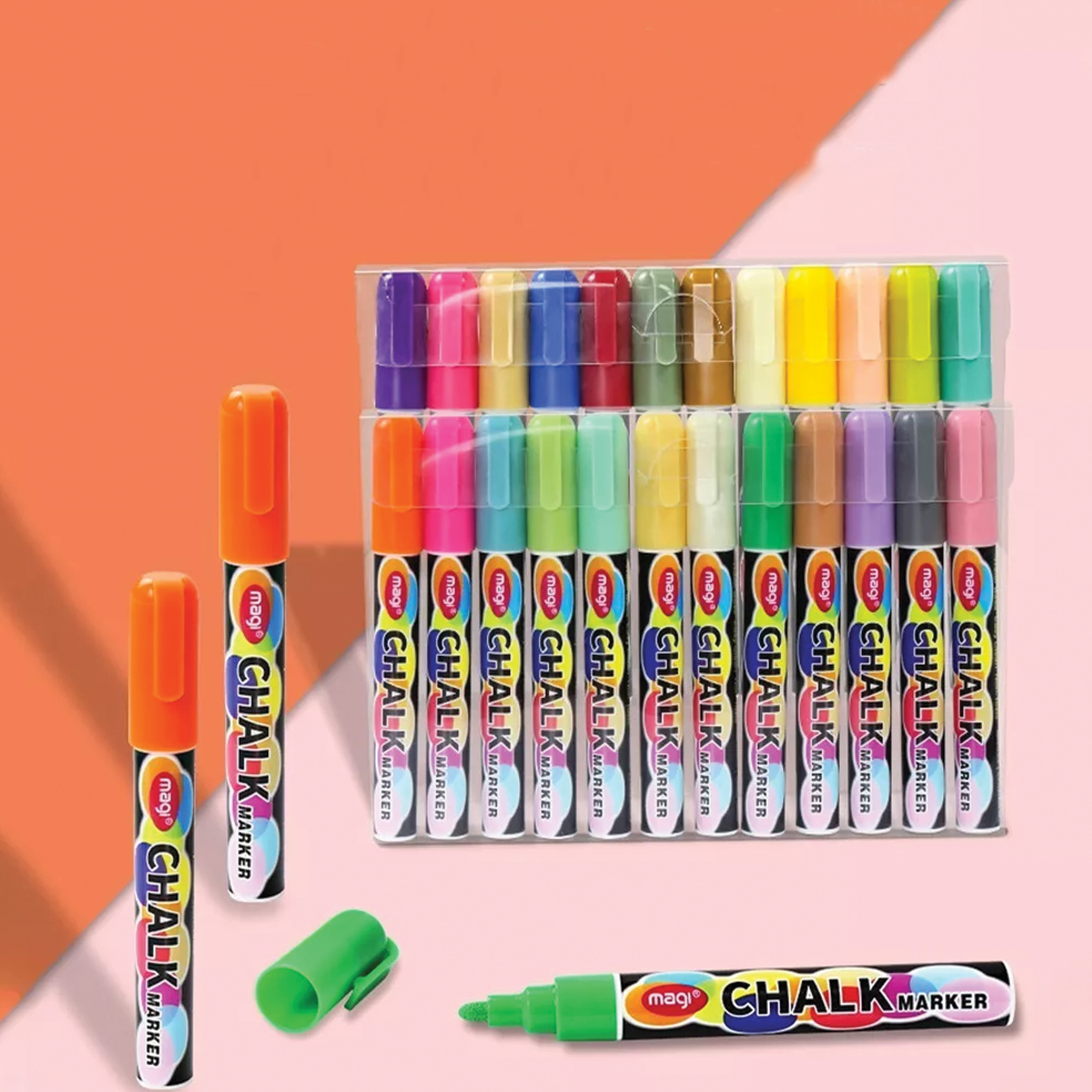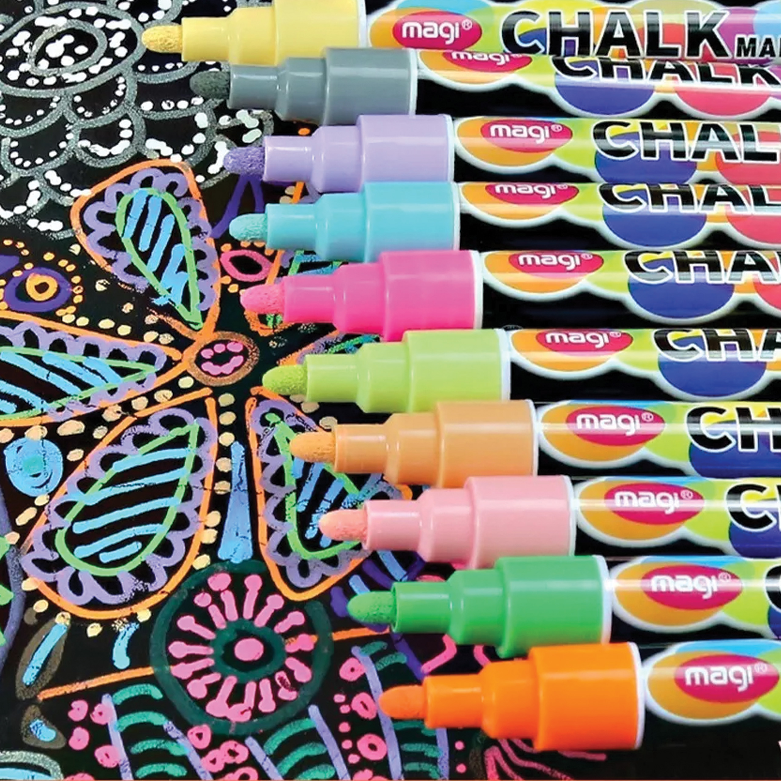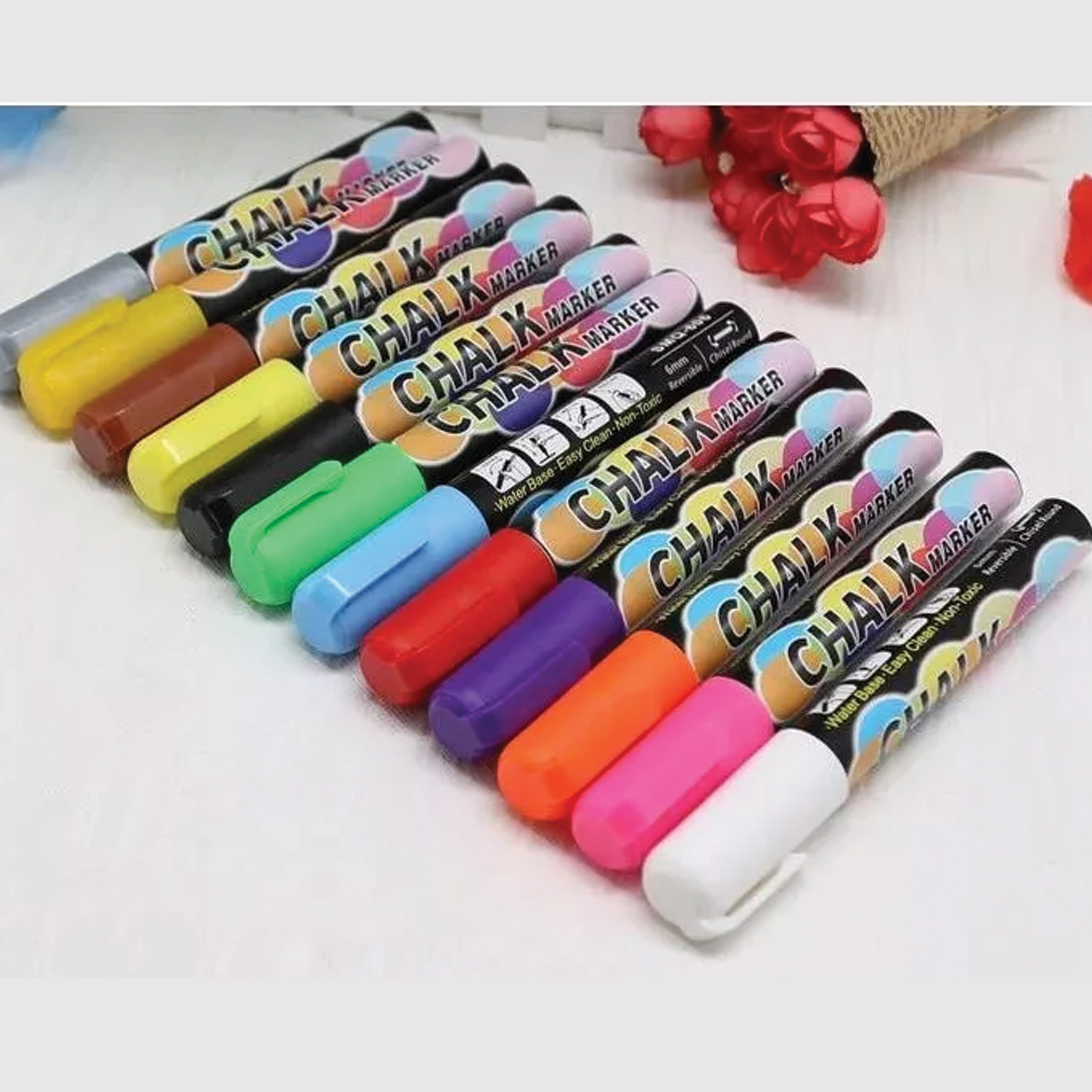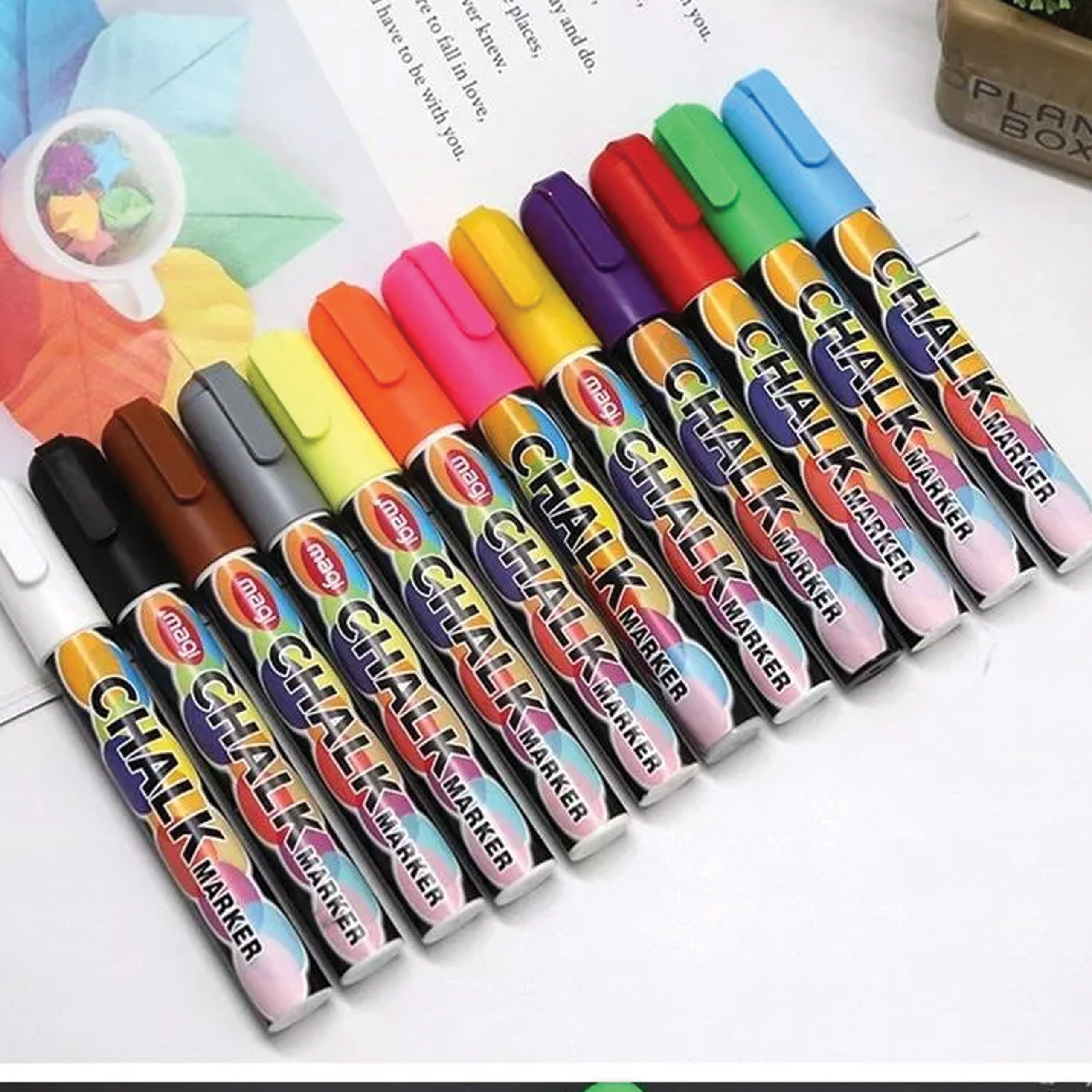 Wysokiej jakości markery kredowe idealne dla różnego rodzaju tablic. Tusz który został użyty w markerach jest niepylący, dzięki czemu bezpiecznie mogą ich używać nawet dzieci. Struktura chemiczna płynnego tuszu sprawia że jest on dobrze przylegający do gładkich powierzchni takich jak tablice czy szkło.