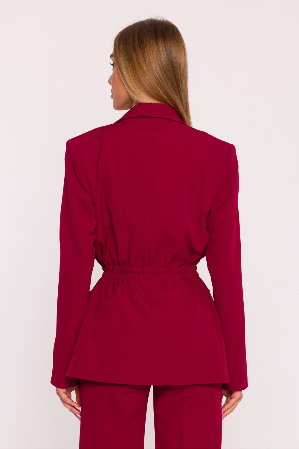 Stylowa marynarka damska uszyta z gładkiej tkaniny o matowym wykończeniu to połączenie klasyki z nowoczesną funkcjonalnością. Luźny fason typu oversize zapewnia swobodę ruchu, a regulacja w talii troczkami z metalowymi końcówkami pozwala dopasować marynarkę do sylwetki, podkreślając kobiece wcięcie. Model posiada klasyczny kołnierz z klapami oraz pojedyncze zapięcie na guzik, które w połączeniu z trokami tworzy eleganckie i jednocześnie nowoczesne wykończenie. Długie rękawy bez mankietów oraz duże naszywane kieszenie dodają praktyczności i subtelnego, casualowego charakteru. Marynarka jest w całości podszewkowana, co gwarantuje komfort noszenia i perfekcyjne ułożenie materiału. Fason o prostym kroju, z możliwością regulacji w pasie, sprawia, że marynarka świetnie komponuje się zarówno z eleganckimi, jak i codziennymi stylizacjami. Zaprojektowana i uszyta w Polsce, stworzona dla kobiet, które cenią wygodę, styl i nowoczesne detale w klasycznym wydaniu.