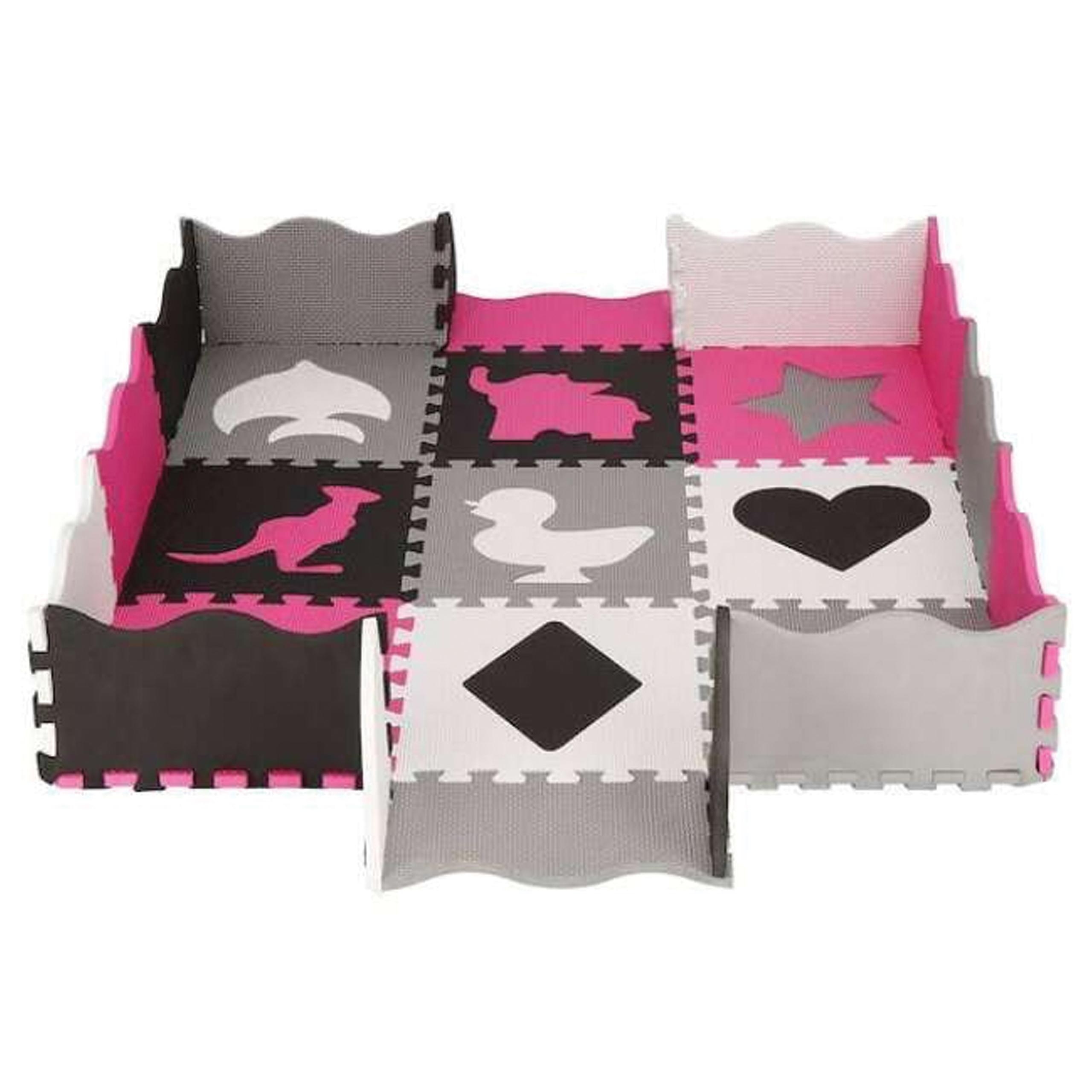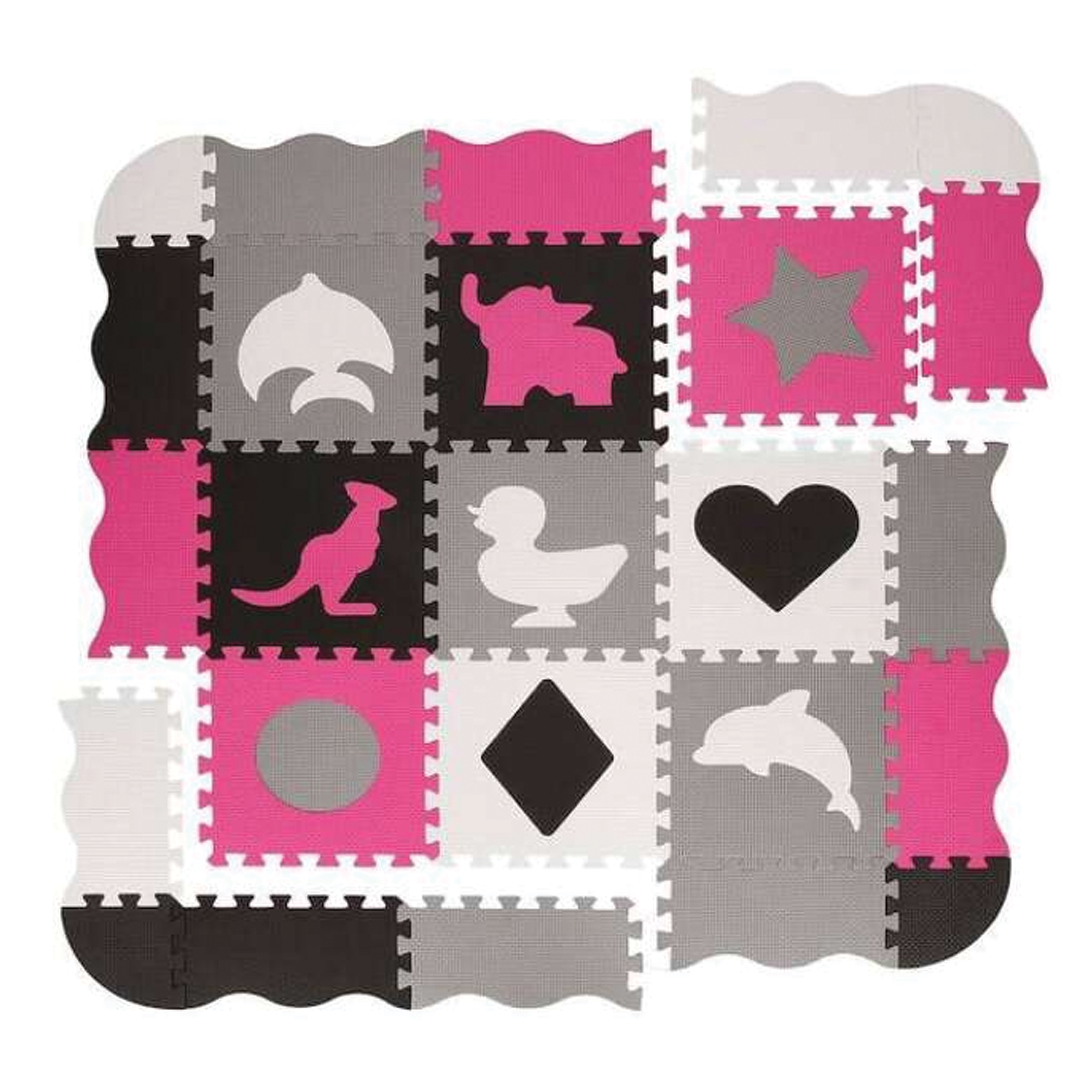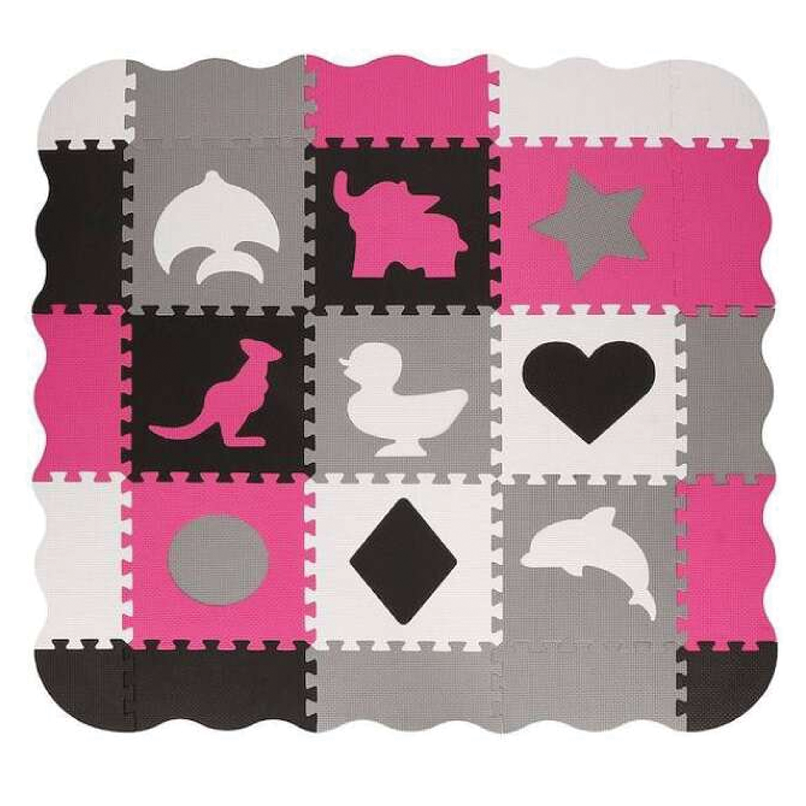 ✅ Liczba elementów: 25 w tym 9 sztuk puzzli z wzorami zwierząt i kształtów, 12 puzzli tworzących ściany oraz 4 narożniki