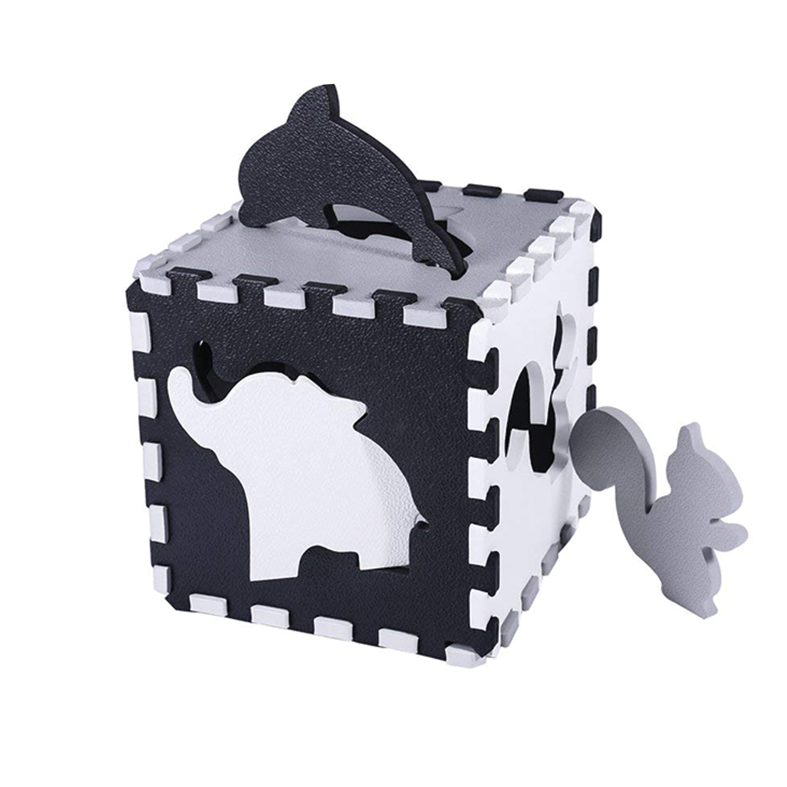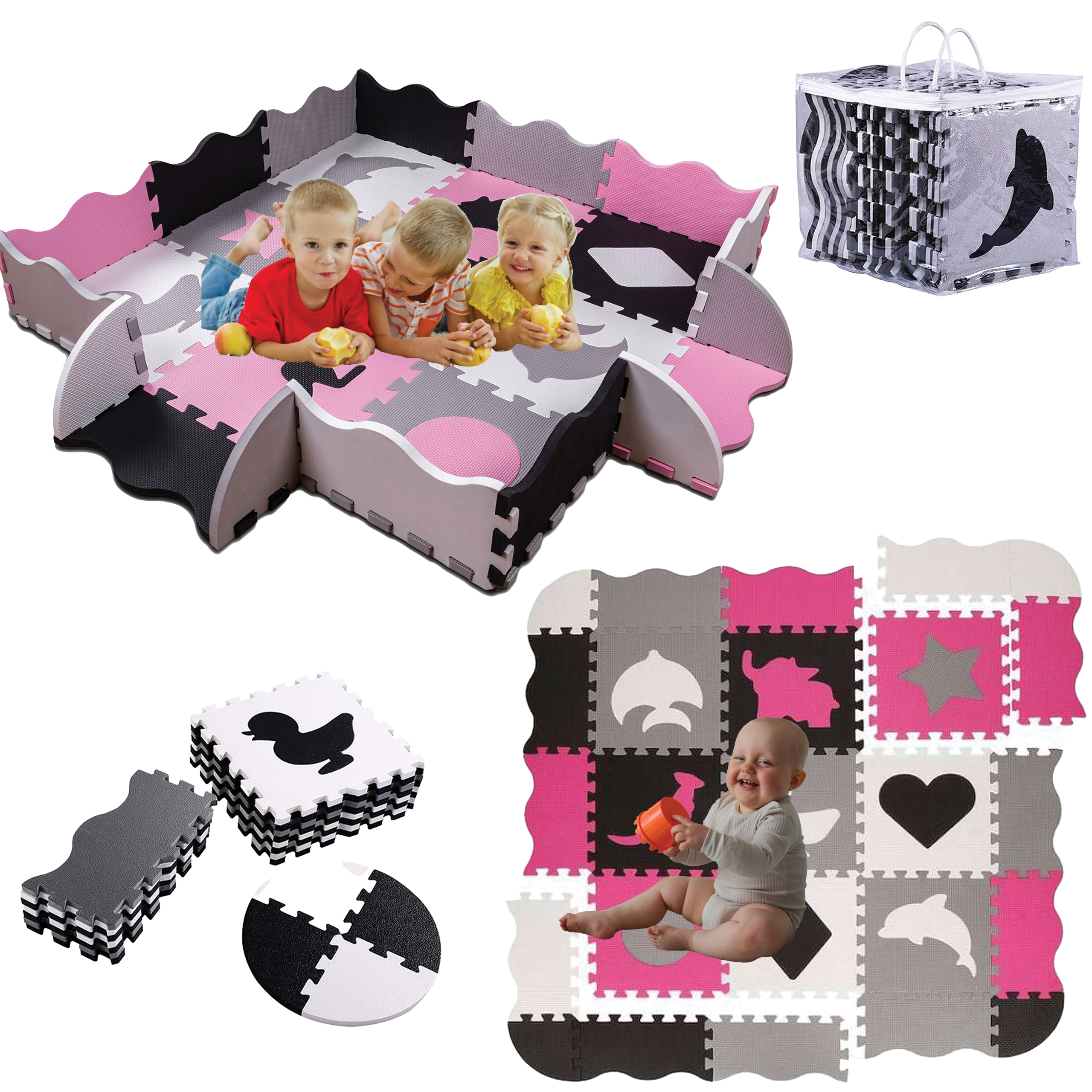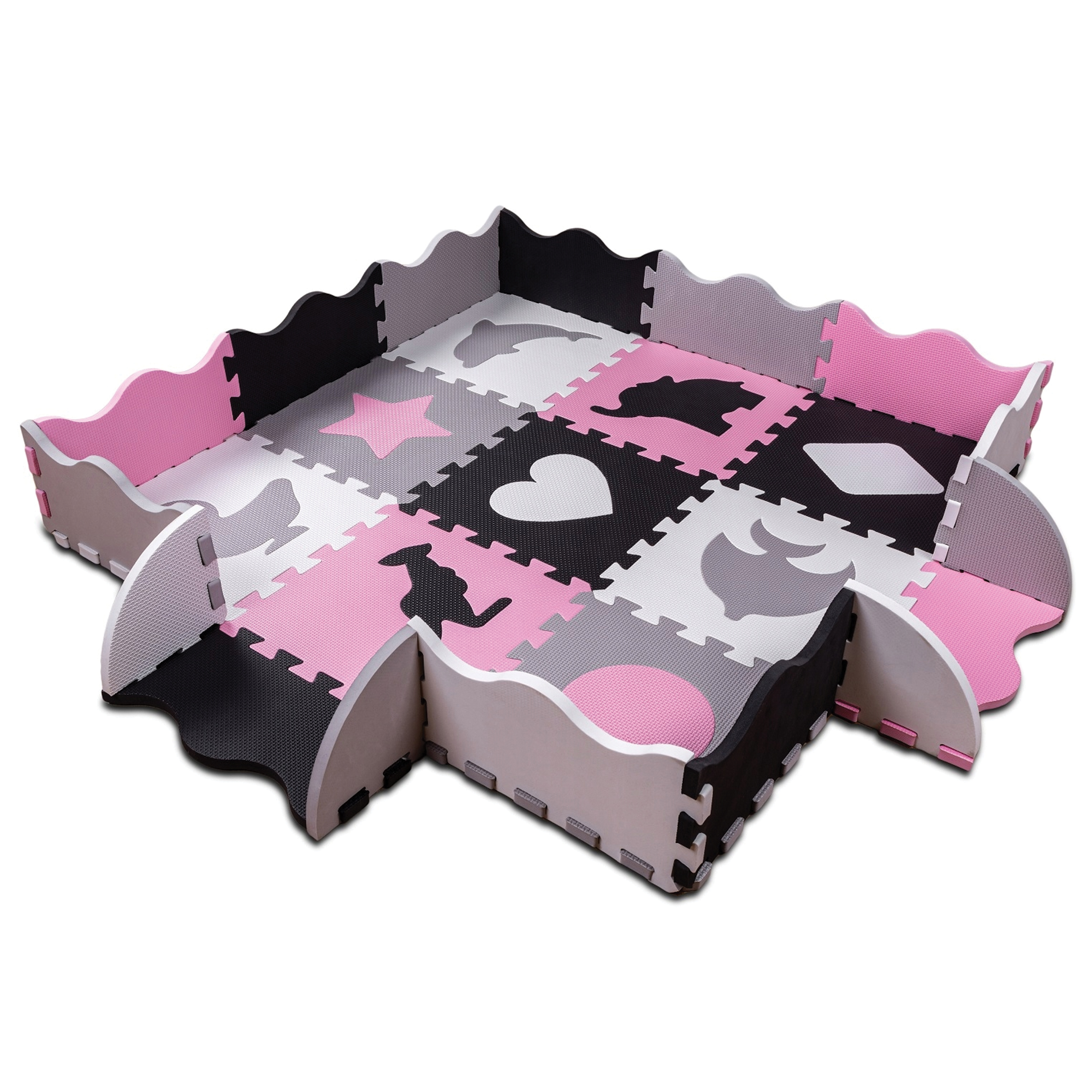 ✅ Liczba elementów: 25 w tym 9 sztuk puzzli z wzorami zwierząt i kształtów, 12 puzzli tworzących ściany oraz 4 narożniki