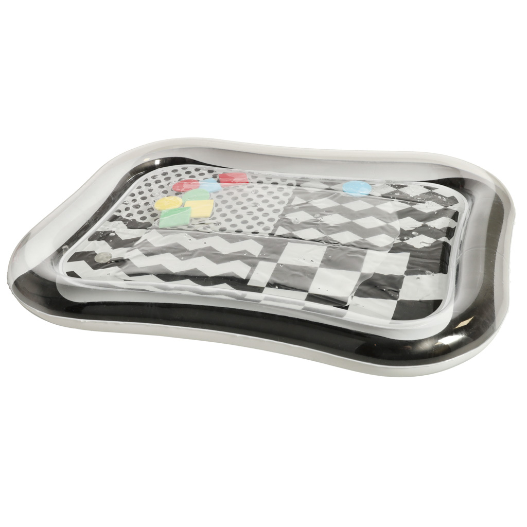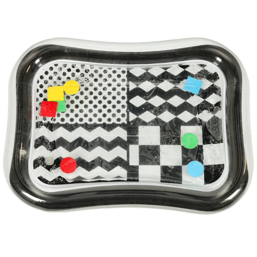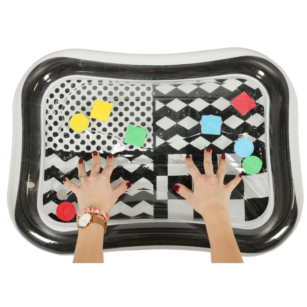 Duża, sensoryczna mata wodna, którą można napompować powietrzem lub napełnić wodą. Ozdobiona szlaczkami w kontrastowym odcieniu. Posiada ruchome kolorowe klocki geometryczne. Wykonana z wytrzymałego tworzywa. Kolor: czarno-biały. Wymiary: 65x50cm.