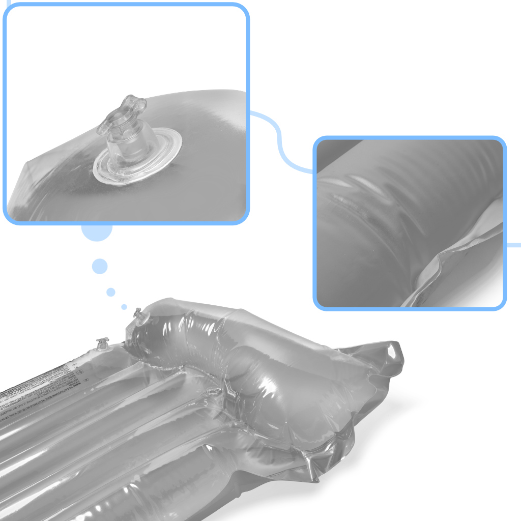 Klasyczny dmuchany materac do wody – posiada dwie komory powietrze oraz wyprofilowaną poduszkę, aby dryfowanie na wodzie było czystą przyjemnością. Kolor: szary. Wymiary: 183 cm x 76 cm.