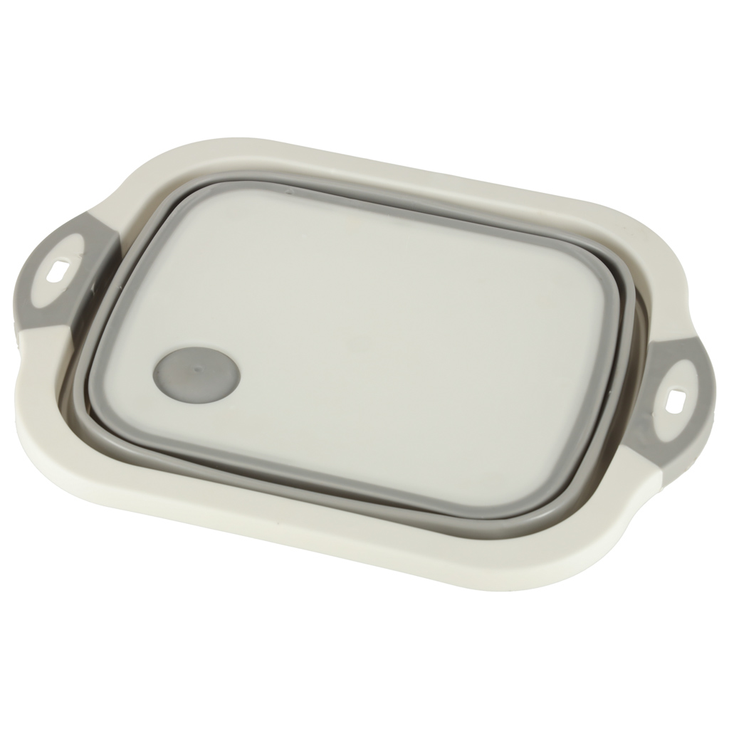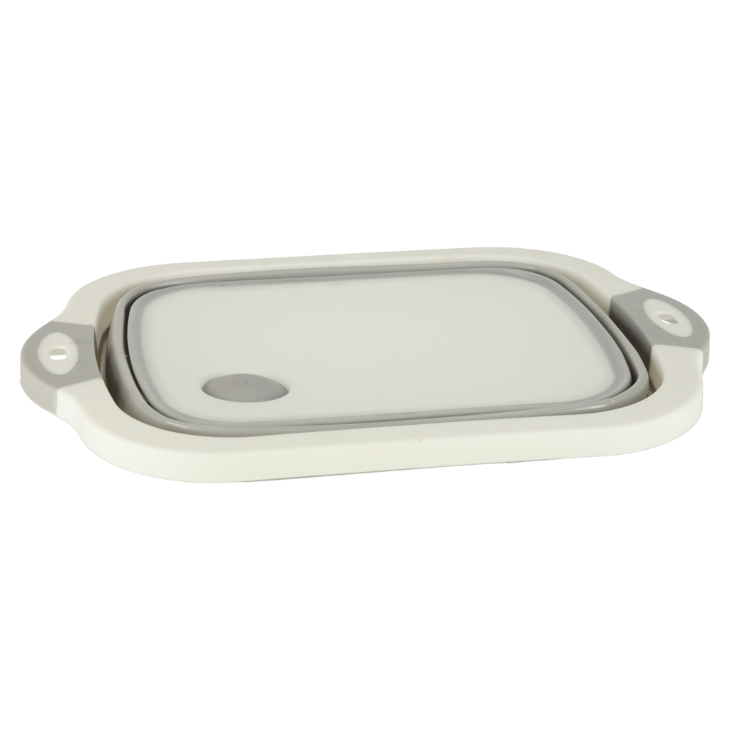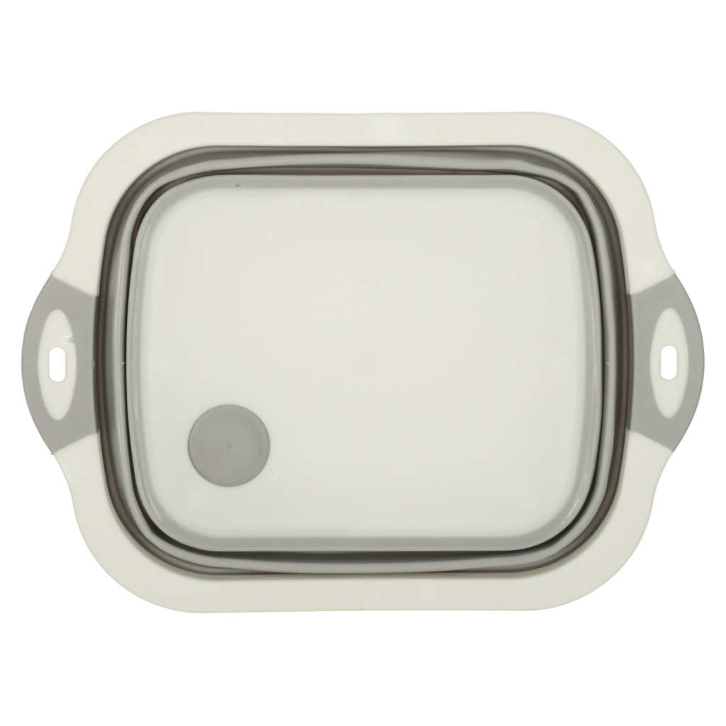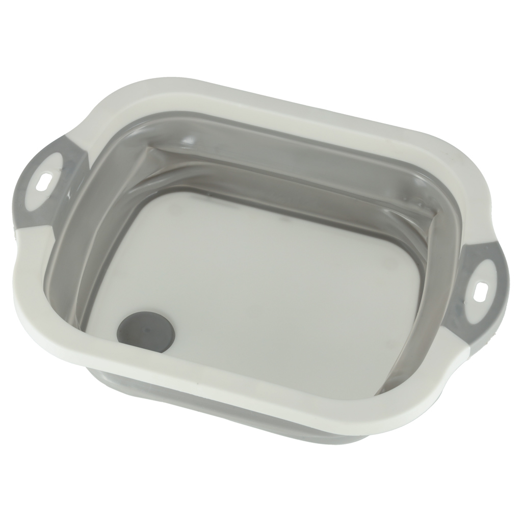 Składana miska silikonowa 5,5 L, 4w1: miska, deska do krojenia (25,5×20 cm), ociekacz z korkiem, zlew turystyczny. Składana konstrukcja (37×27×2,5 cm) oszczędza miejsce. Silikon odporny na odkształcenia, bezpieczny dla żywności.