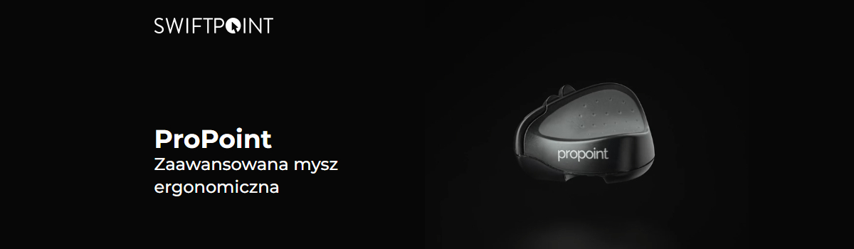 Propoint to zaawansowana technologicznie myszka ergonomiczna firmy SwiftPoint, która została zaprojektowana z myślą o najbardziej wymagających użytkownikach, którzy poza samą wygodą użytkowania, szukają urządzenia multifunkcjonalnego nadającego się do pracy także w podróży. Bezprzewodowy model ProPoint łączy tryb myszy z funkcjami ułatwiającymi szybki dostęp do najczęściej wykorzystywanych aplikacji, dokumentów czy linków. Posiada też funkcję sterowania gestami i może być wykorzystywana jako fizyczny prezenter na sali, czy też wirtualny prezenter podczas wideokonferencji. Myszka dba również o nasze zdrowie poprzez odpowiednie planowanie przerw w naszej pracy. Ergonomiczny kształt i kompaktowa budowa (5,6 x 4 x 3,3 cm) gwarantują wygodne użytkowanie w każdych warunkach. Dzięki technologii Bluetooth 4.0 można bez problemu połączyć się z innymi urządzeniami mobilnymi, takimi jak notebook czy tablet. Model ProPoint umożliwia bezprzewodową pracę przez 2 tygodnie przy pełnym naładowaniu baterii.