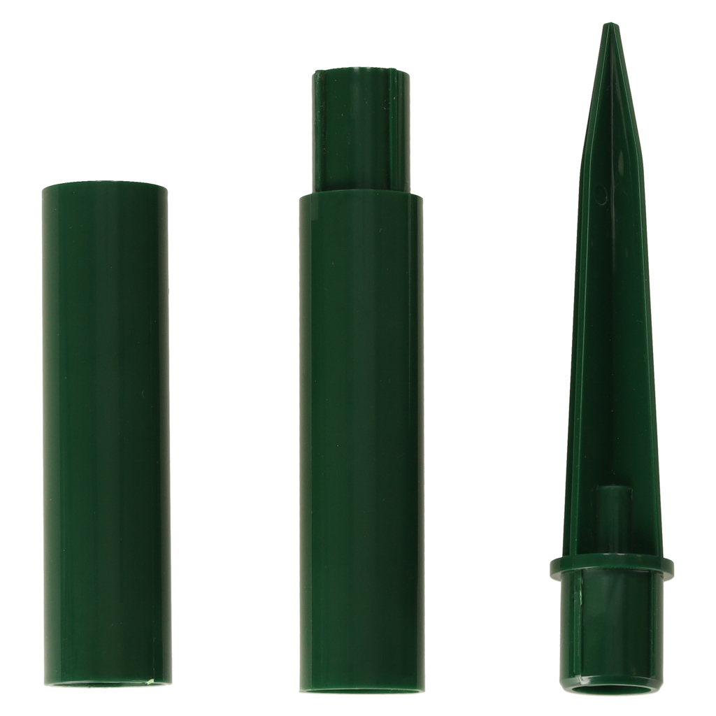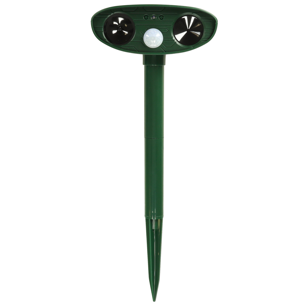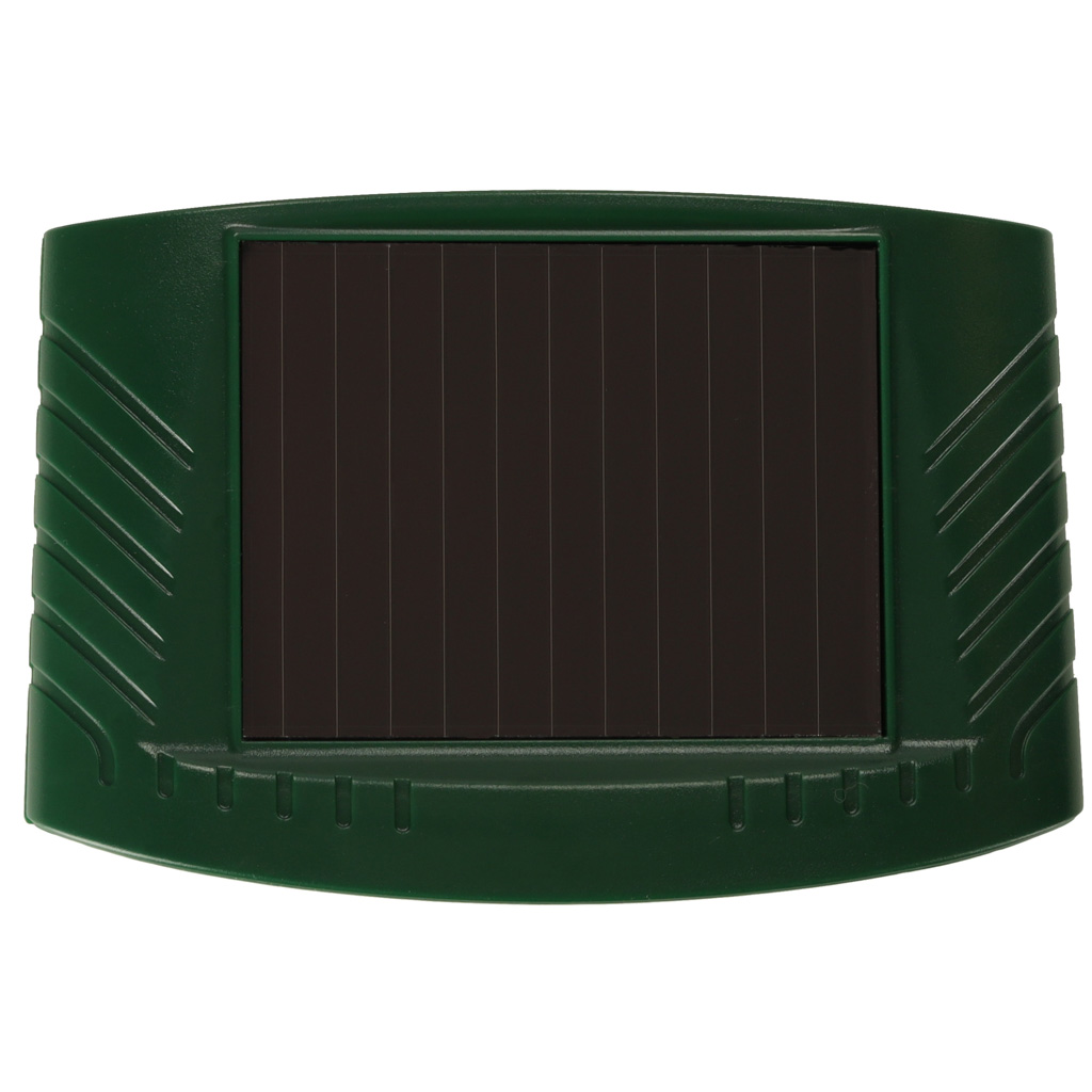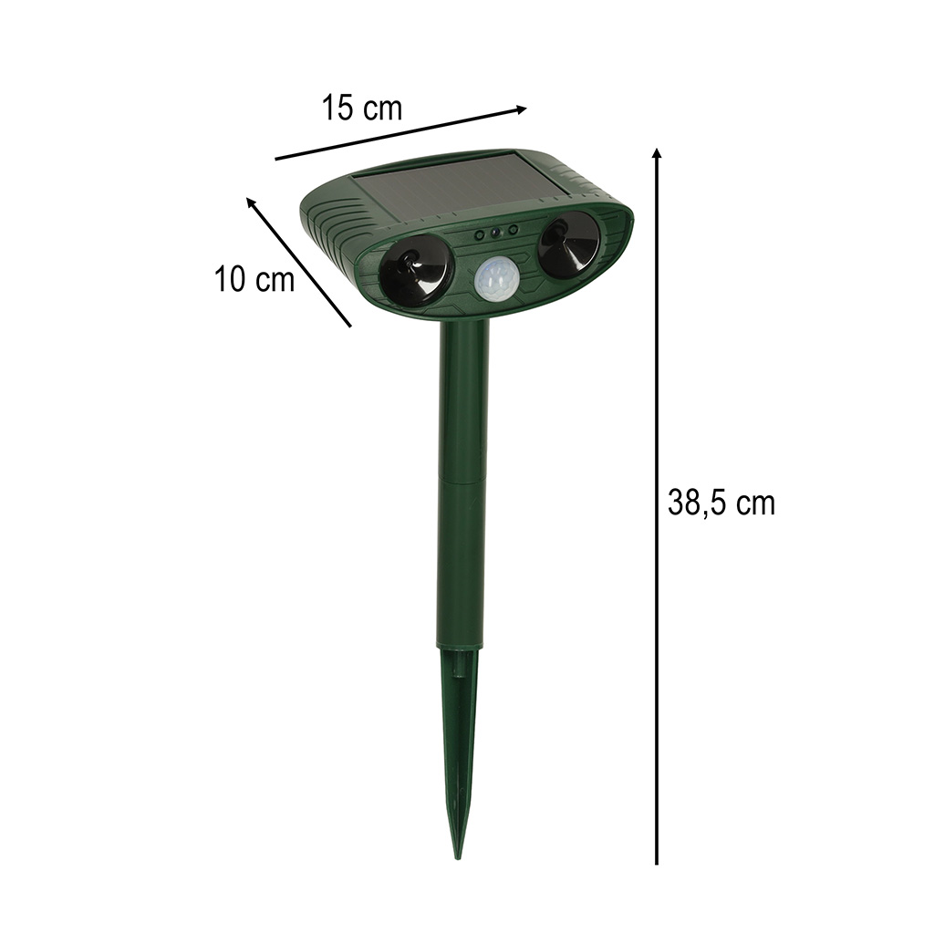 Materiał: trwały, odporny na warunki pogodowe plastik. Kolor: zielony. Rodzaj działania: ultradźwięki + czujnik ruchu. Zasilanie: energią słoneczną (panel solarny). Zasięg działania: 6-8 metrów. Wymiary odstraszacza: 15 cm × 10 cm × 5,8 cm. Wysokość nóżki