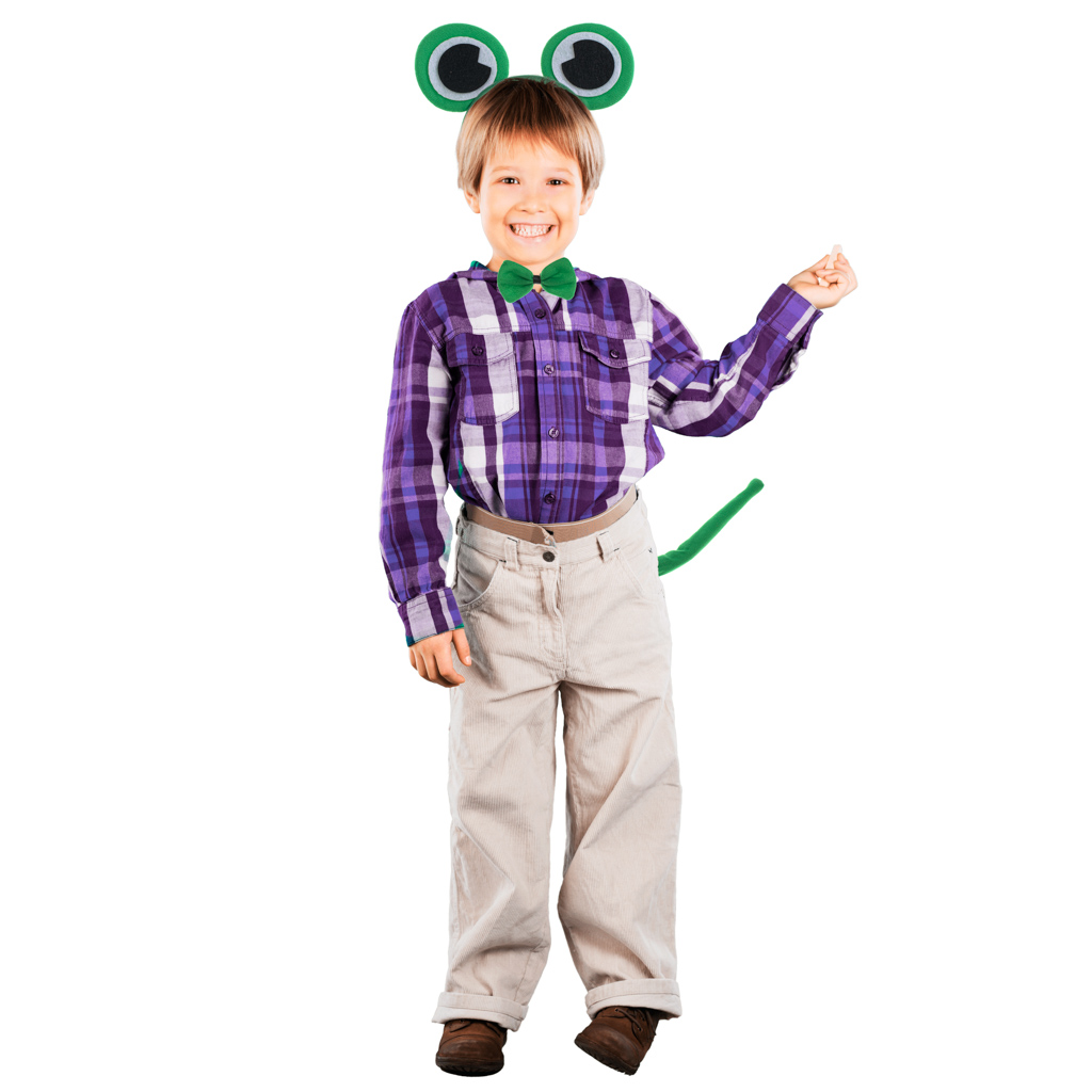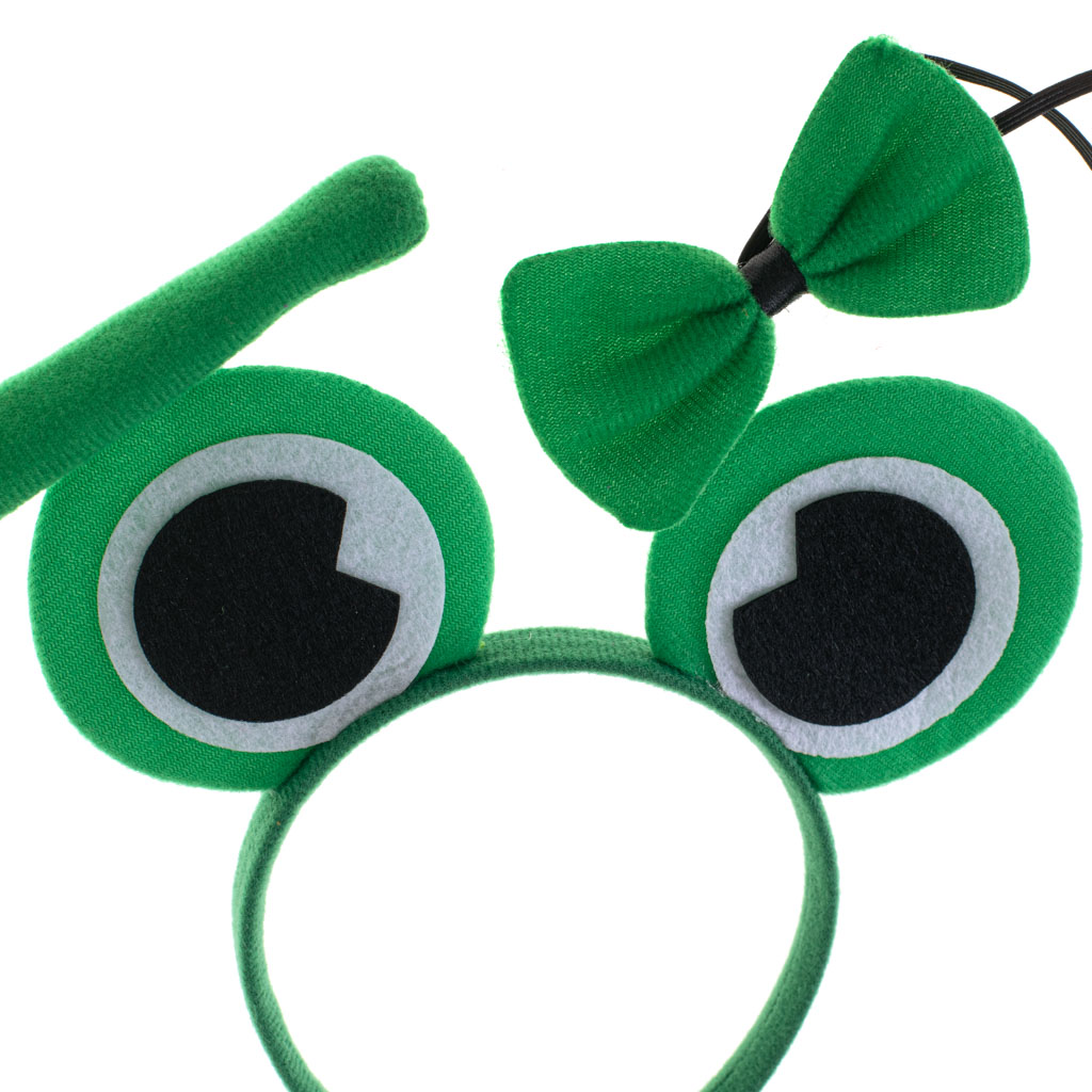 Fantastyczny strój żabki – doskonale się sprawdzi jako kostium na balu przebierańców, imprezach tematycznych czy Halloween. W zestawie: ogon, opaska z oczkami, muszka. Kolor: zielony. Wymiary: ogona: 26,5cm, muszki: 9,5×5,5cm, oczek na opasce: 8x7cm.