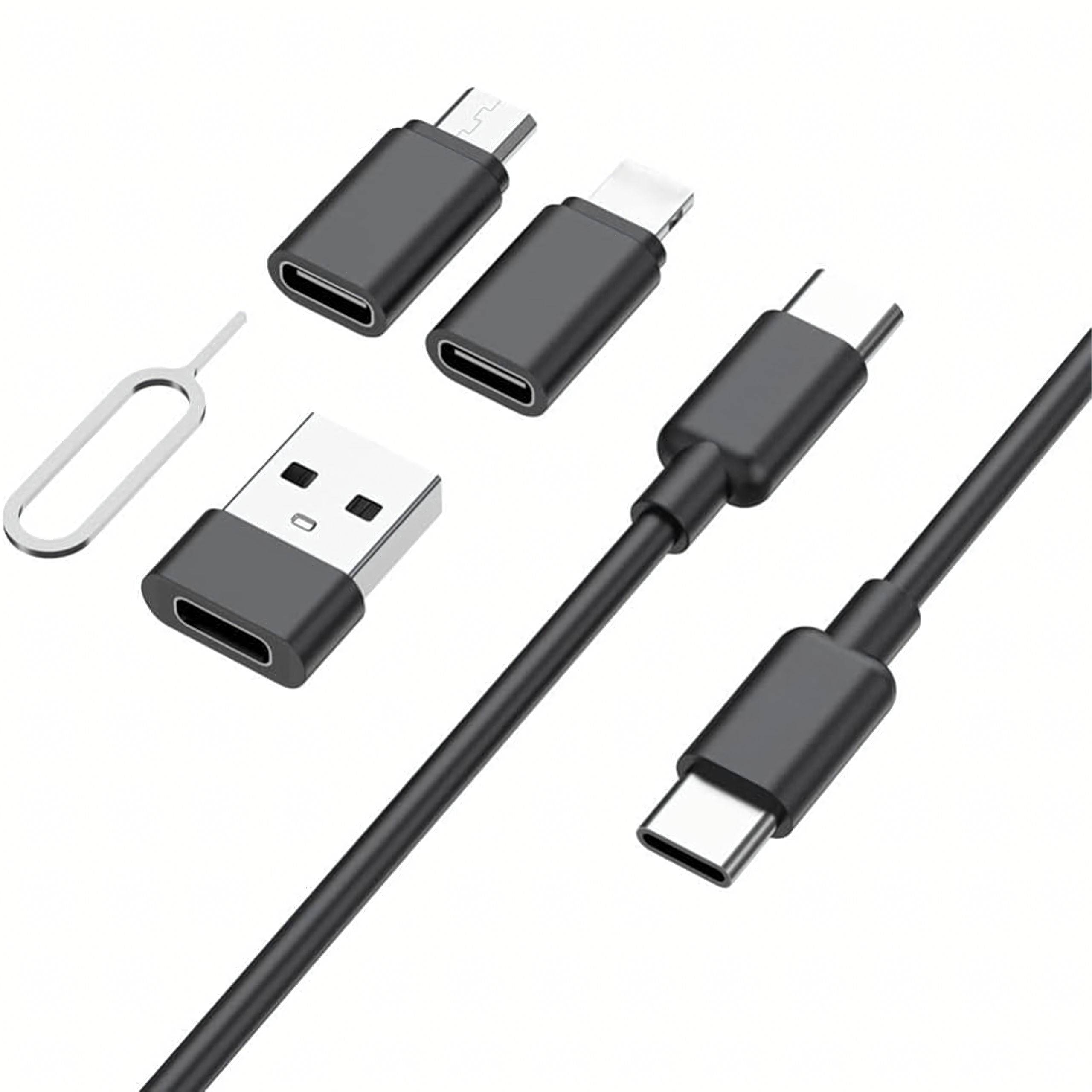 Organizer 5w1 z adapterami USB-C, Lightning, Micro USB i USB-A – kompaktowy zestaw do ładowania i przesyłu danych, idealny w podróży. Wyposażony w szpilkę do tacki SIM oraz miejsce na 3 karty, zapewnia wygodę i porządek zawsze pod ręką.