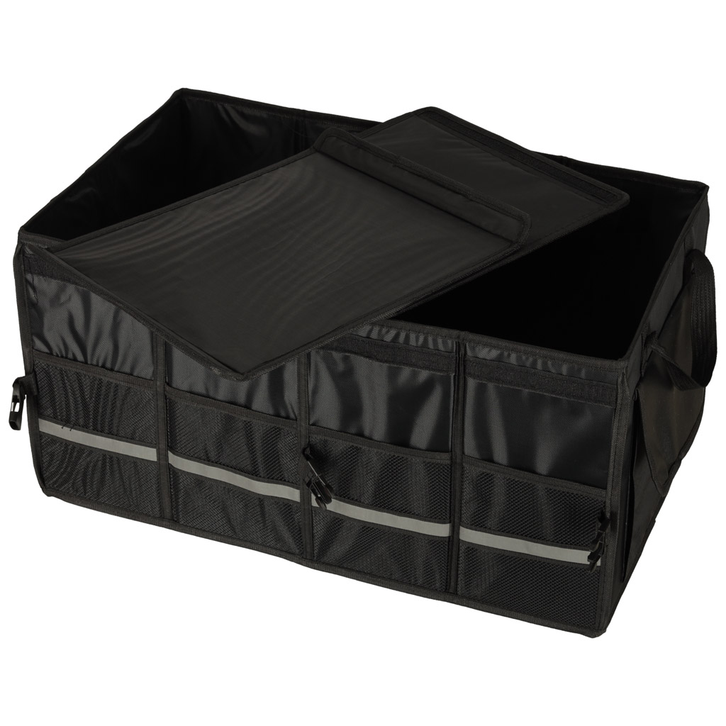 Organizer do bagażnika z odpinanymi przegródkami i klapą. Zmieści się w bagażniku dzięki odpinanym klamrom. Ma odblaskową taśmę, przez co torba jest widoczna w ciemności. Wymiary: 60 cm x 35 cm x 30 cm, kolor: czarny