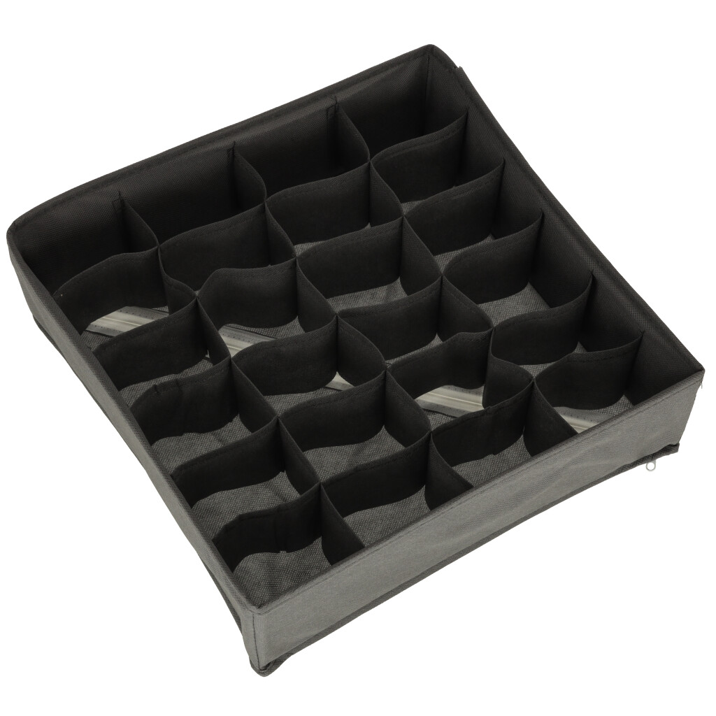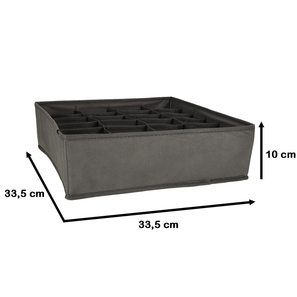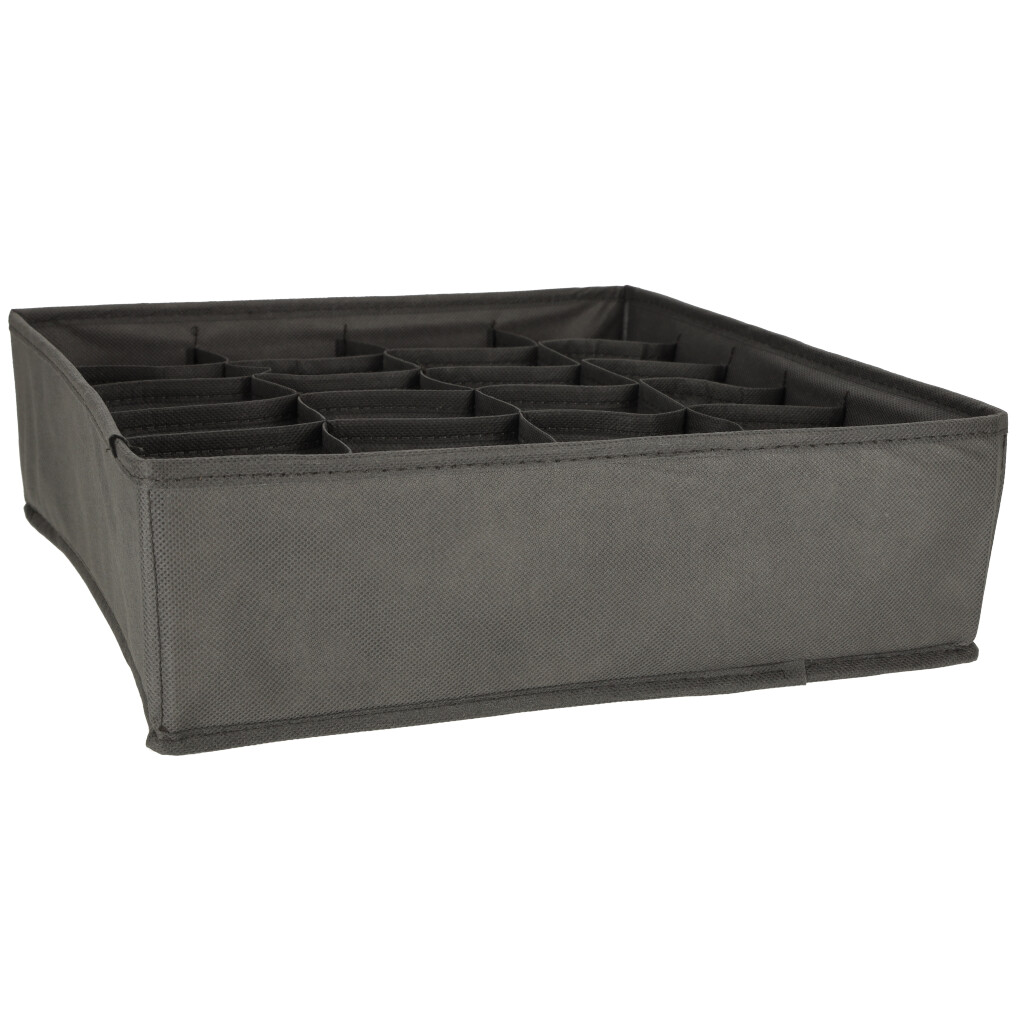 Duży organizer na bieliznę – dzięki niemu nastanie koniec bałaganu w szufladzie. Organizer ułatwi uporządkowanie bielizny oraz wszelkich akcesoriów. Brak pokrywki sprawia, że sięganie po rzeczy jest łatwiejsze. Kolor: szary. Wymiary: 33,5 x 33,5 x 10 cm.
