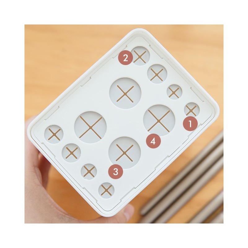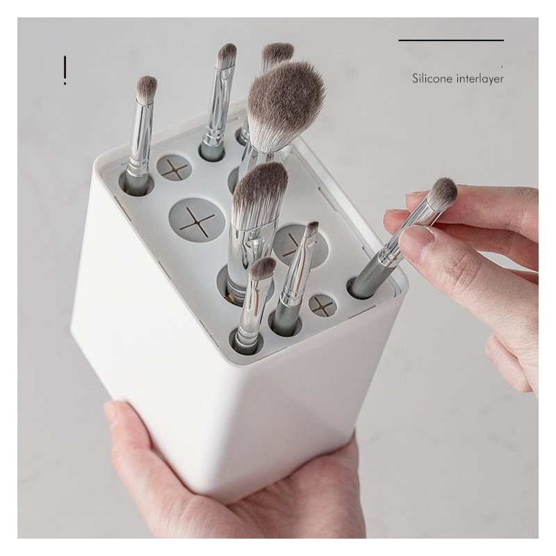 Dzięki antypoślizgowej warstwie silikonowej pędzle nie wypadają po ustawieniu pojemnika do góry nogami.