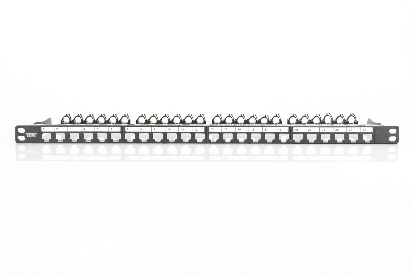 Panel krosowy high density 19″ 24x keystone, ekranowany, 0.5U, czarny, prowadnica kabli, pola opisowe
