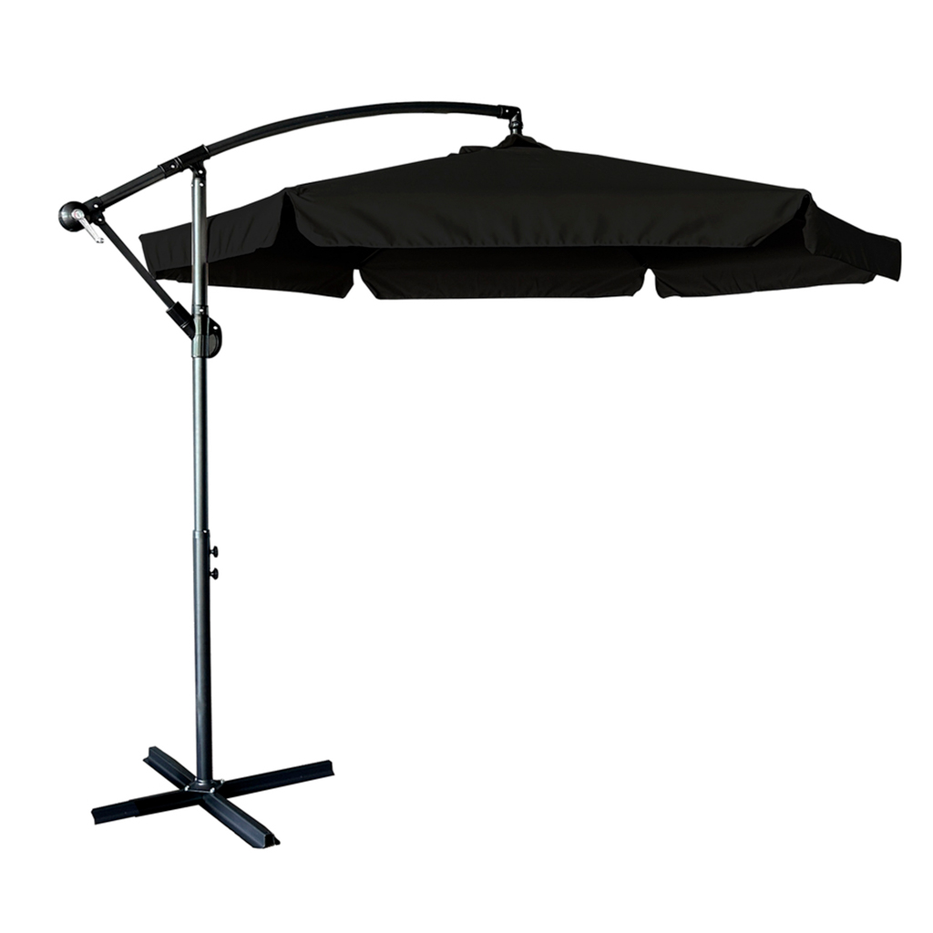 Parasol ogrodowy o średnicy 290 cm z okrągłą czaszą w kolorze czarnym, na stalowym stelażu z 6 ramionami. Regulowana wysokość 240-287 cm, mechanizm korbowy z regulacją kąta nachylenia, system wentylacji, podstawa krzyżowa 99×99 cm.