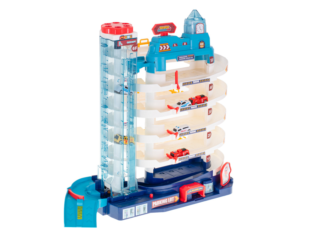Świetny pięciopoziomowy garaż z windą i autami. Przypadnie do gustu każdego malca. Automatyczna winda pozwoli dostać się autom na samą górę parkingu. Zabawa rozwija zdolności manualne oraz refleks. Zasilanie: 4x bateria AA. Wym. parkingu: 46x23x42cm.