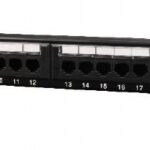 24-portowy patch Panel o rodzaju 110-type, jest przeznaczony do montażu w dowolnym standardowym 19” stojaku lub szafie. W kolorze czarnej stali malowanej proszkowo. Urządzenie cechuje się pozłacanymi stykami (50µ.) Wejście kabla znajduje się w górnej, dolnej lub bocznej części. Posiada tabliczki do opisu na przedniej części panelu. Tylna pokrywa posiada umożliwia zarządzanie przewodami.