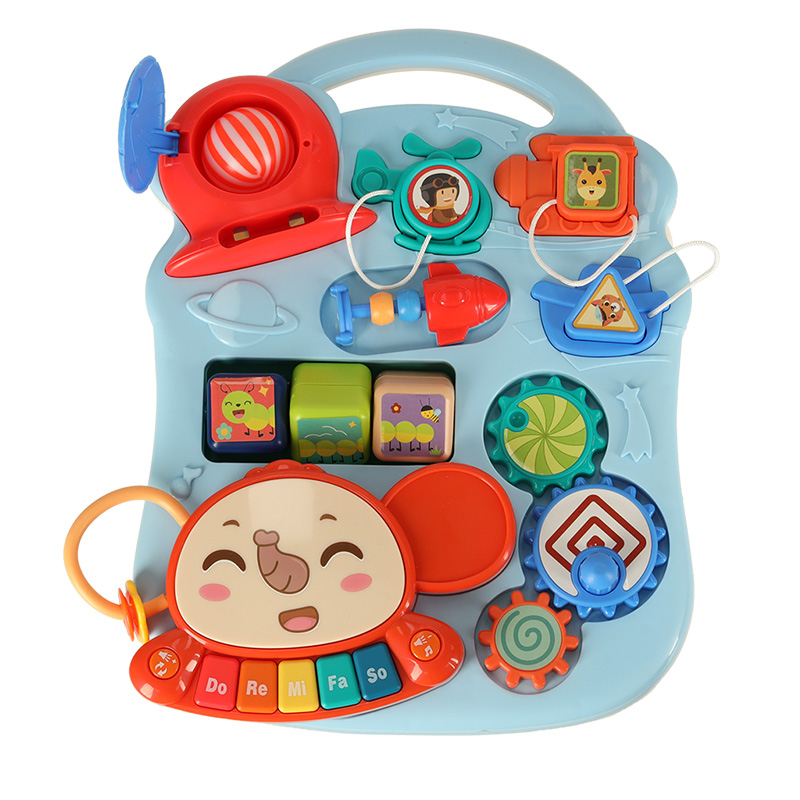 liczne elementy interaktywne – pianinko, plastikowe zębatki, klocki, a także