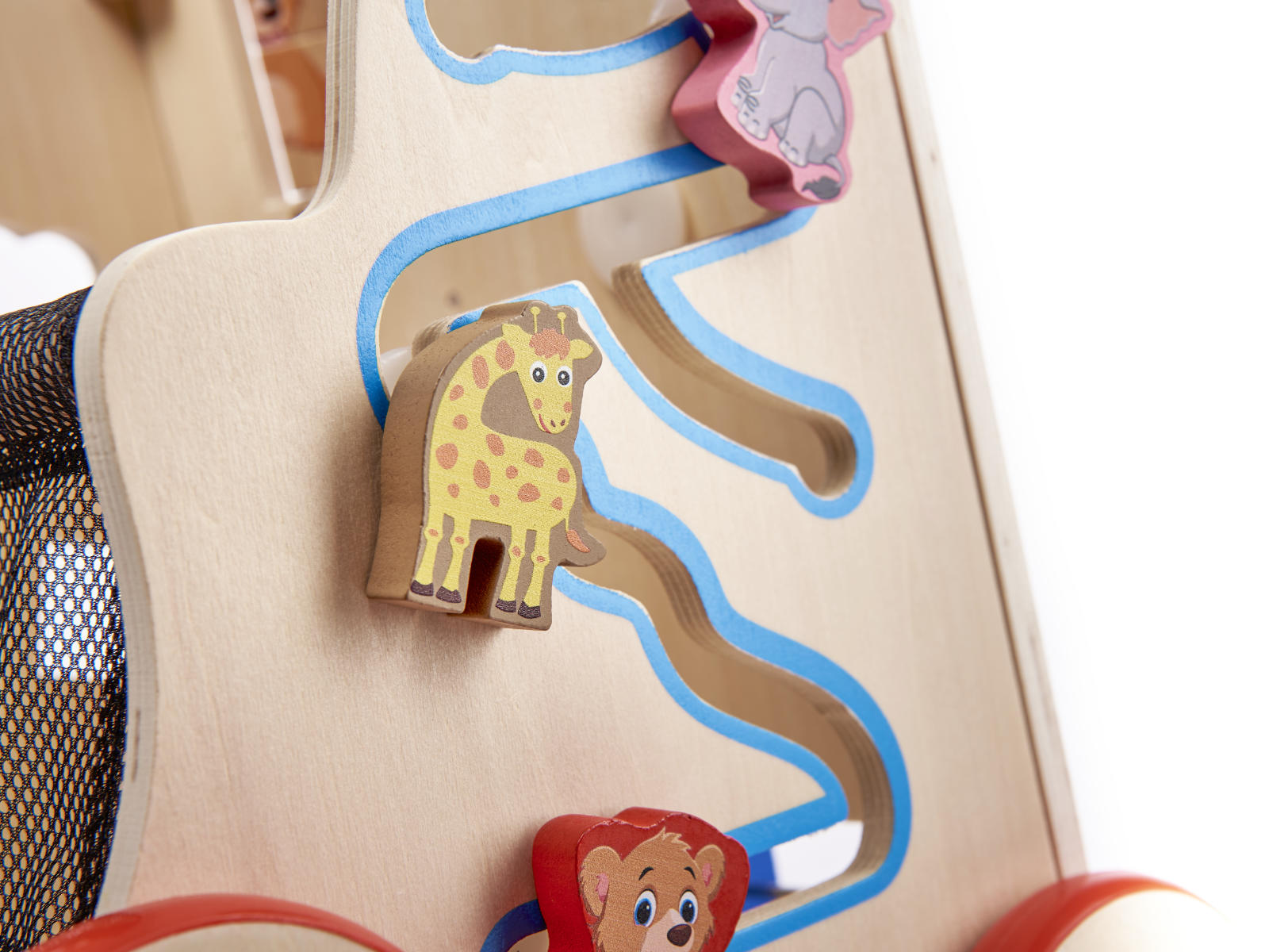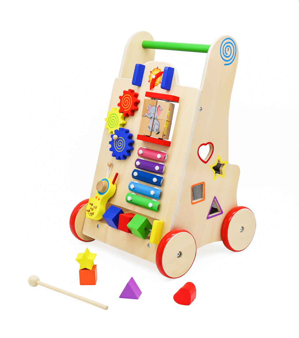 Wielofunkcyjny i drewniany pchacz dla dzieci ułatwi naukę chodzenia. Przedni panel posiada wiele zabawek: koła zębate, układankę obrazkową, ruchome kostki, cymbałki, telefon i zegar. Po bokach umieszczono sorter i labirynt. Wymiary: 51×32,5x31cm.