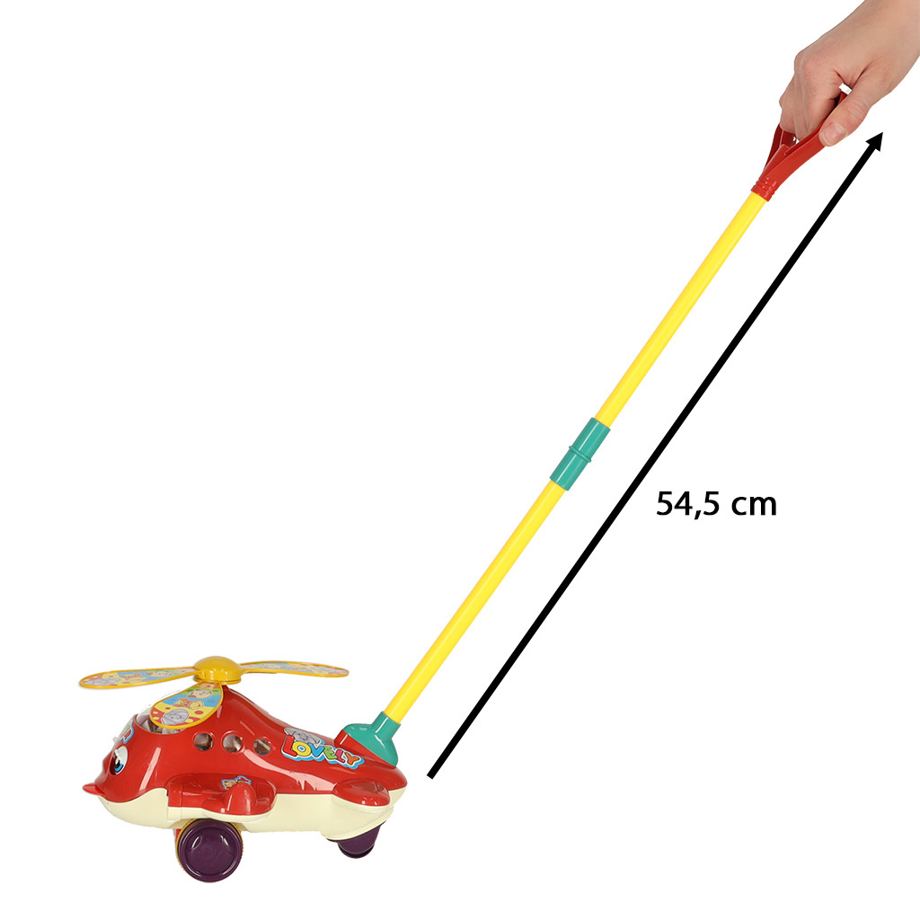 Uroczy pchacz na kiju w formie czerwonego helikoptera będzie towarzyszem dziecka podczas stawiania pierwszych kroków. Dodatkowo wraz z ruchem pchacza, zaczynają się kręcić śmigła oraz słychać dźwięk dzwonka. Tworzywo: plastik. Wymiary: 20x17x14cm.